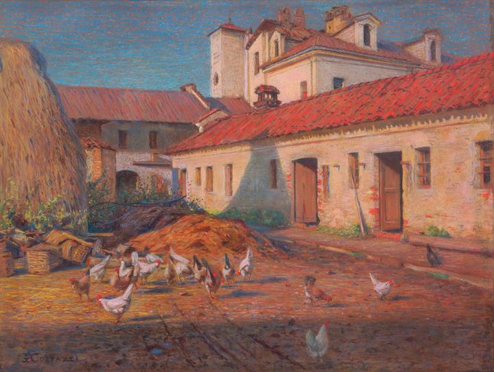 CORTAZZI GIACOMO Odessa 1870 - 1943 Carpi "Galline nell'aia" 47x62 pastelli...
