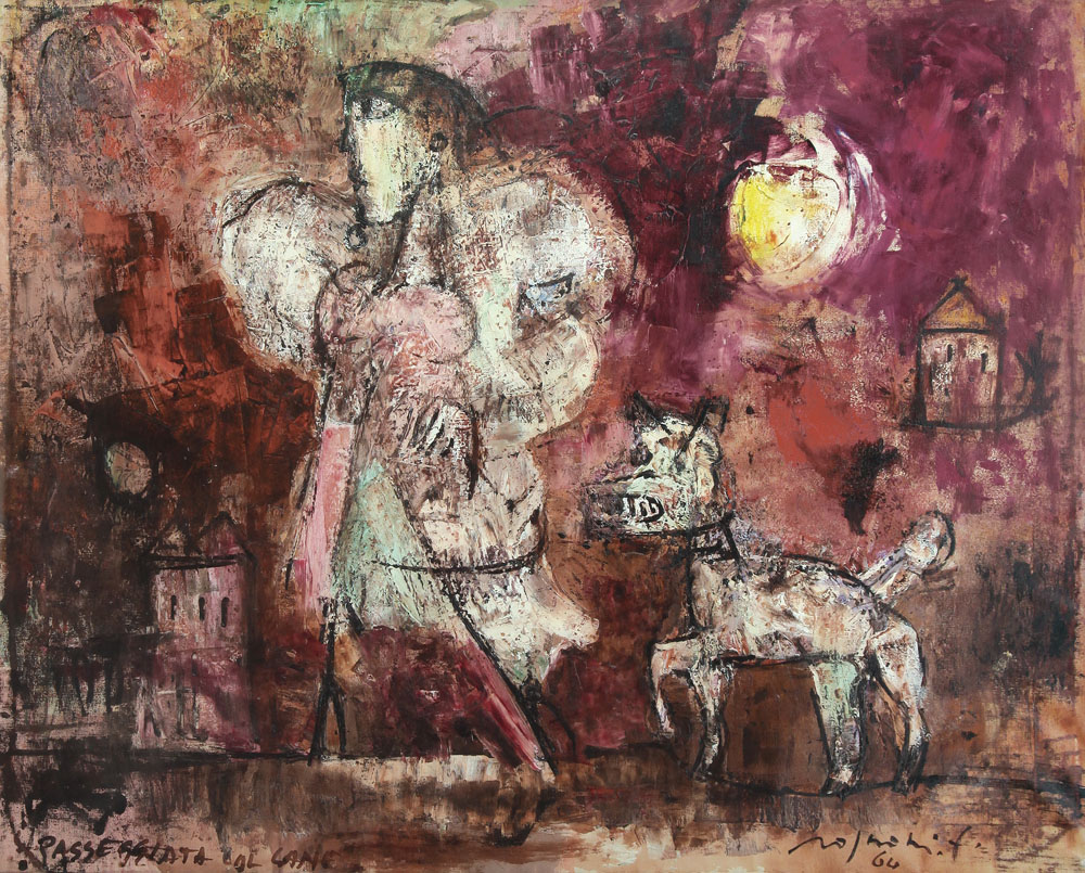 FRANCO ROGNONI Milano 20/09/1913 - Milano 11/03/1999 Passeggiata col cane, 1964 olio su tela cm. 81x100, firma e anno in basso a destra, titolo in basso a sinistra, titolo, firma, anno ed etichetta della Galleria Dell'Annunciata (Mi) al retro, dichiarazione d'autenticità della moglie Mariuccia Rognoni Noè su foto.