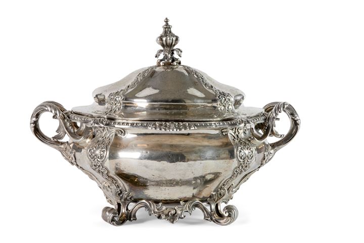 ZUPPIERA CON COPERCHIO Grande zuppiera in argento 925/1000, Londra 1852, di...
