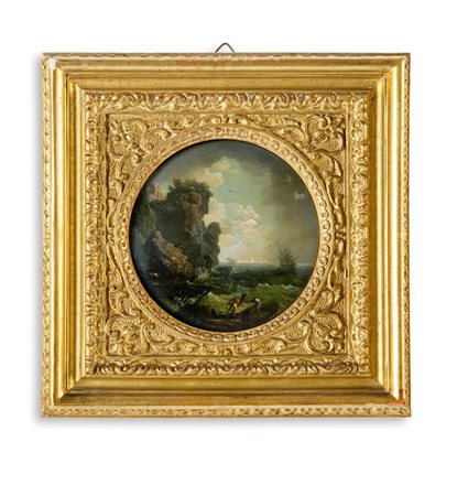 Ad olio, eseguita su coperchio di scatola, raffigurante scena di naufragio, probabilmente tratta da un dipinto di Vernet; Francia seconda metà XVIII secolo
