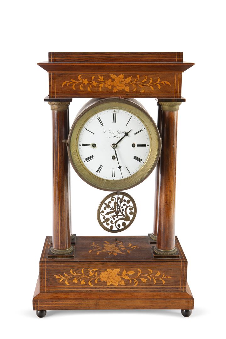 a forma di tempietto, in legno di palissandro intarsiato in acero a motivi vegetali, XIX secolo; quadrante in smalto con numeri romani recante scritta "Von Guttle in Wien". Nella base è inserito un carion (funzionante)