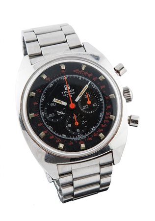 Cassa carré in due parti con tasti a pompa. Quadrante serigrafato con indici applicati, contatore piccoli secondi al 9 ore al 6 minuti al 3, scala tachimetrica periferica