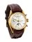Cassa in oro in tre parti con tasti a pompa. Quadrante con indici applicati contatore secondi e 24 ore al 9 ore al 6 minuti ed indicazione giorno mese al 12, datario periferico a sfera.