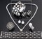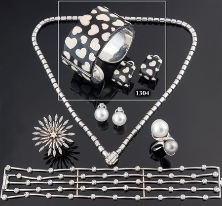 Demi-parure composta da coppia di orecchini e bracciale rigido con smalti di colore nero con decori a cuore in smalto bianco