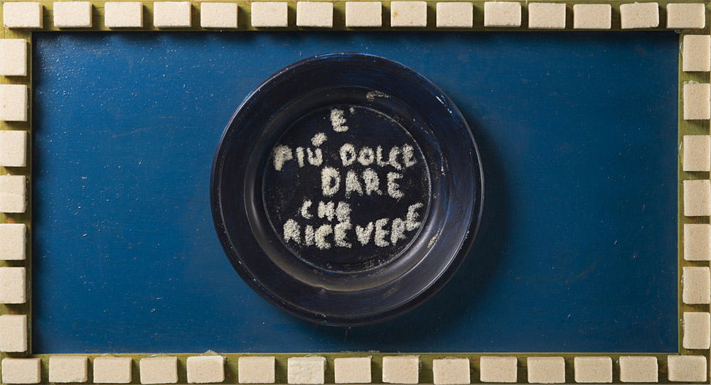 Aldo Mondino (Torino 1938 - 2005) - "È più dolce dare che ricevere" assemblage di zollette di zucchero, legno, plastica e smalto su tavola cm 28x52x4 Firmato al retro Provenienza Galleria Il Punto, Torino Galleria La Polena, Genova Collezione privata, Milano Opera accompagnata da certificato di autenticità su fotografia rilasciato dall'Archivio Aldo Mondino, Milano, in data 26 aprile 2007 con il n. 20070426160258
