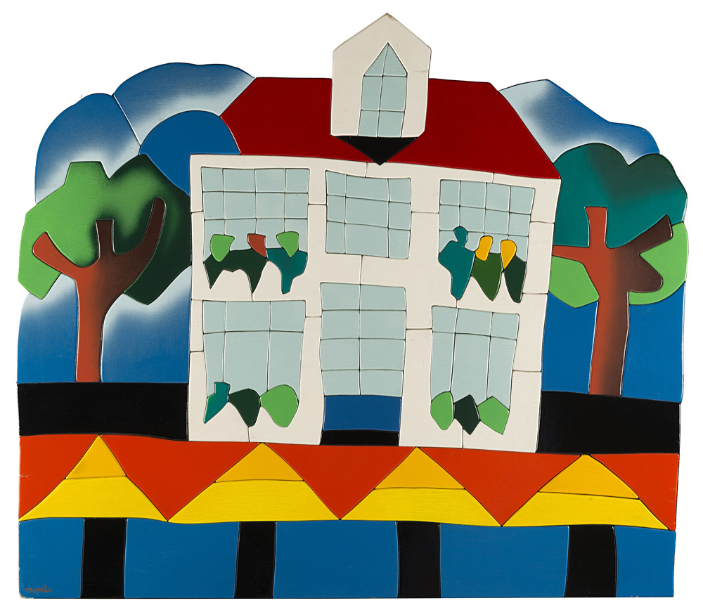 Ugo Nespolo (Mosso Santa Maria 1941) - "Così carino..." acrilici e intarsi di legni, cm 90x103 Firmato in basso a sinistra. Firmato e titolato al retro
