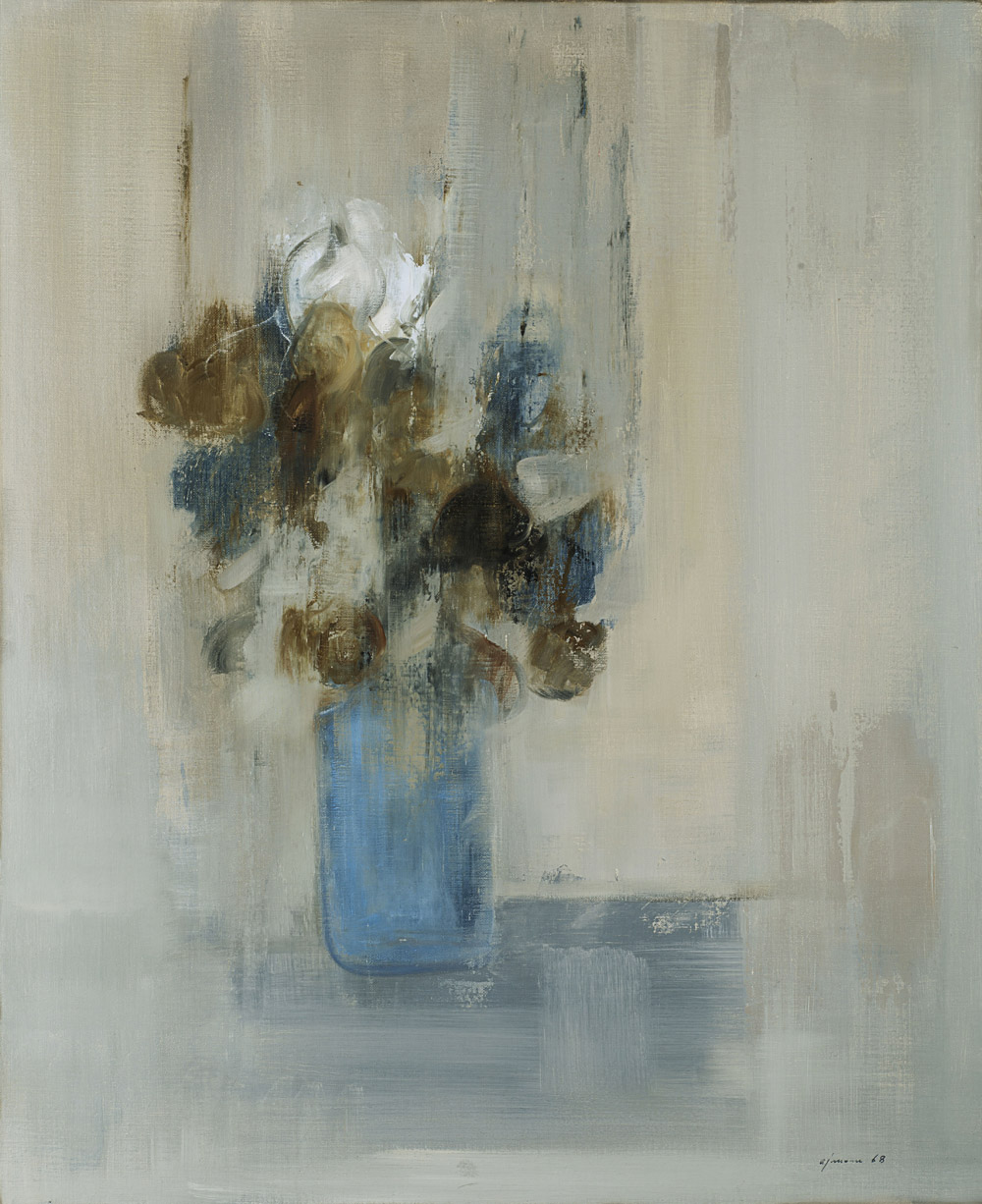 Giuseppe Ajmone (Carpignano Sesia 1923 - Romagnano Sesia 2005) - "Il fiore bianco" 1968 olio su tela, cm 73x60 Firmato e datato 68 in basso a destra Titolato e datato 1968 al retro Provenienza Galleria Sianesi, Milano Collezione privata, Milano
