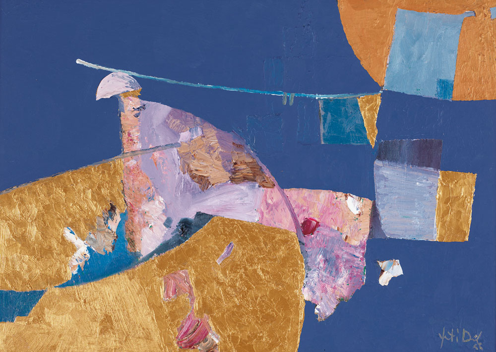 DANILO MANENTI Cagliari 1951 Composizione in blu, 2003 olio e acrilico su cartone telato cm. 50x70, firma e anno in basso a destra, firma, titolo, anno e archivio dell'artista al retro, presenta un altro dipinto a pastelli firmato e datato al retro, dichiarazione d'autenticità dell'artista su foto, pubblicato sul catalogo della mostra "Danilo Manenti, Dynamis IV" tenutasi presso il Museo Santa Giulia dal 21 giugno al 5 luglio 2009, pagina 12 e in copertina (particolare).