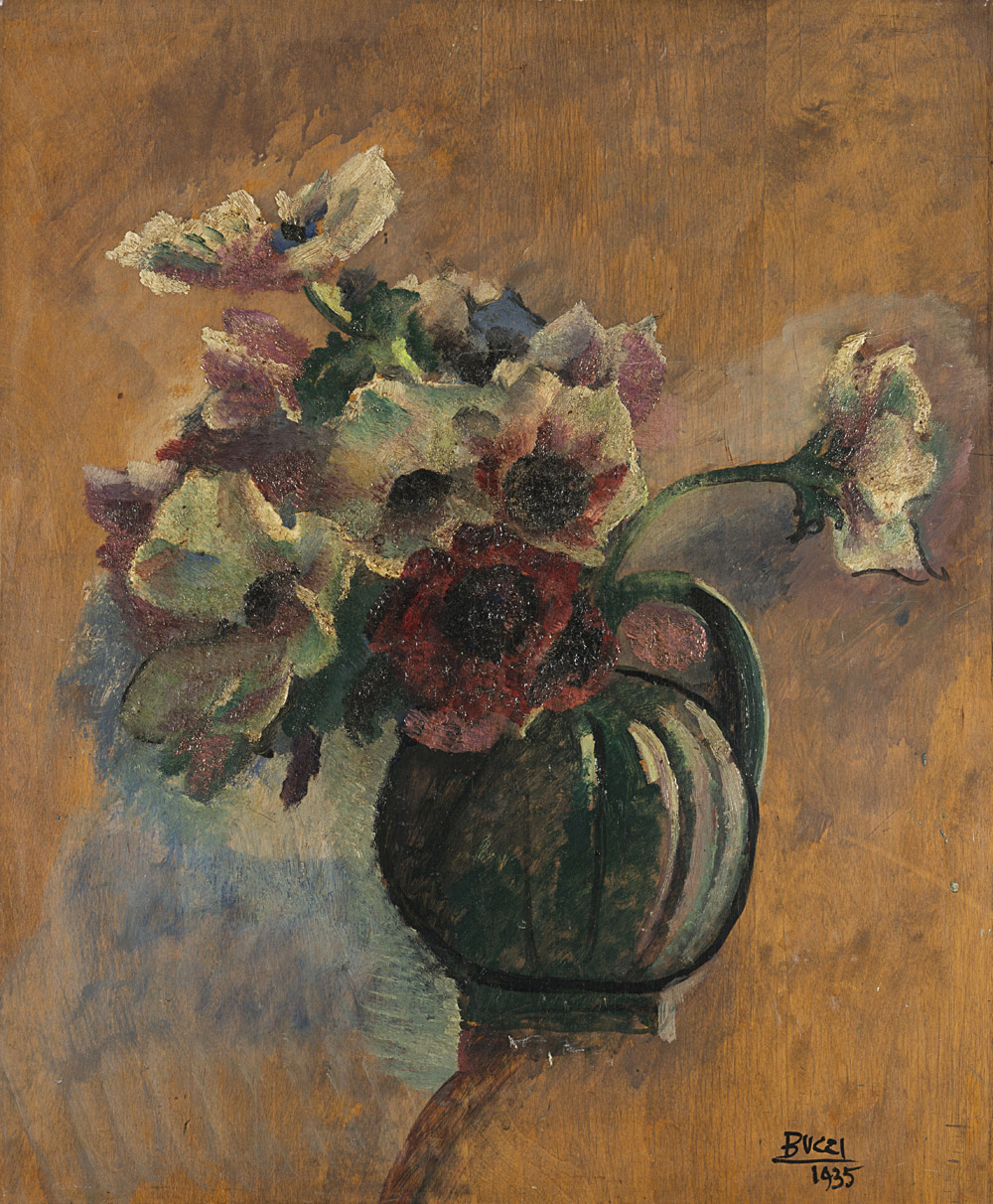 Anselmo Bucci (Fossombrone 1887 - Monza 1955) - "Studio di Anemoni" 1935 olio su tavola, cm 59,5x49 Firmato e datato 1935 in basso a destra. Firmato e titolato al retro Parere di autenticità verbale rilasciato dall'Archivio Anselmo Bucci a cura della Galleria Antologica, Monza