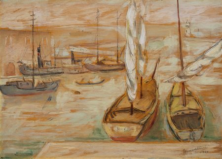 Pio Semeghini (Quistello 1878 - Venezia 1964) - "Porto" 1945 tecnica mista su tavola, cm 25x35 Firmato e datato 45 in basso a destra Provenienza Collezione privata, Milano