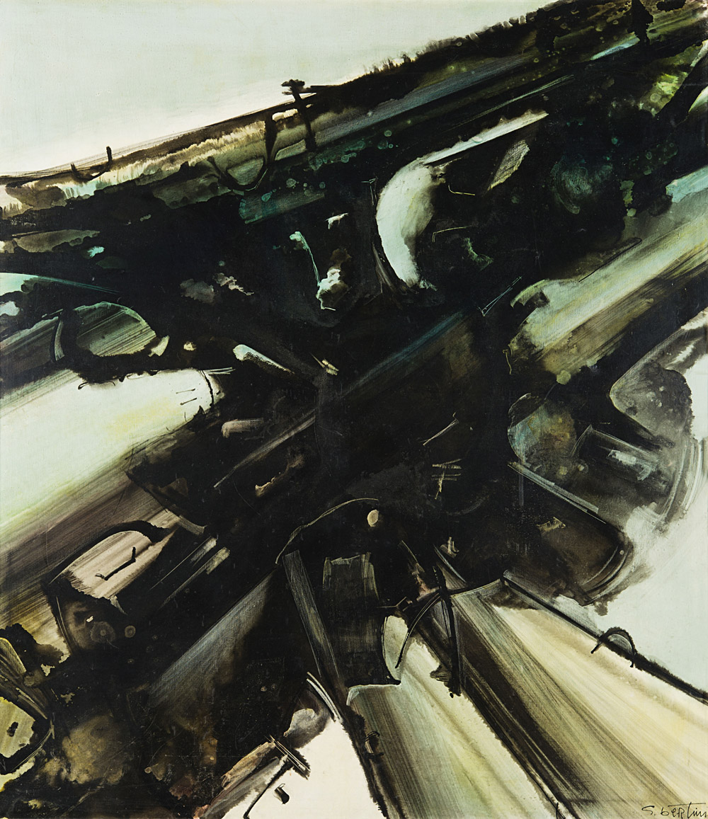 Gianni Bertini (Pisa 1922 - Caen 2010) - "Oedipe a Dynamodocus" 1959 olio su carta intelata dall'artista, cm 160x140 Firmato in basso a destra. Firmato, titolato e datato 1959 al retro della tela Opera accompagnata da certificato di autenticità su fotografia rilasciato dall'Archivio delle opere di Gianni Bertini con il n.8DA1557BB8AD24F537FB