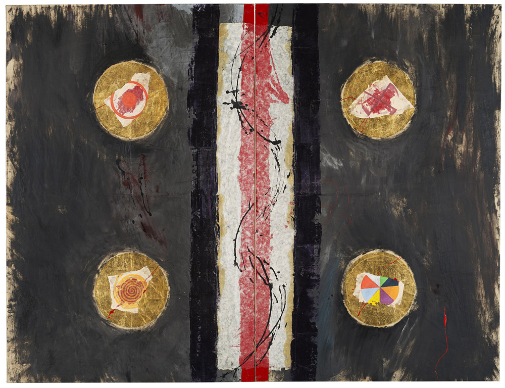 Luciano Bartolini (Fiesole 1948 - Milano 1994) - "Senza titolo" 1986 smalto, olio, collage e foglia d'oro su tela, cm 151x200 Firmato e datato 1986 al retro Provenienza Studio Marconi, Milano Collezione privata