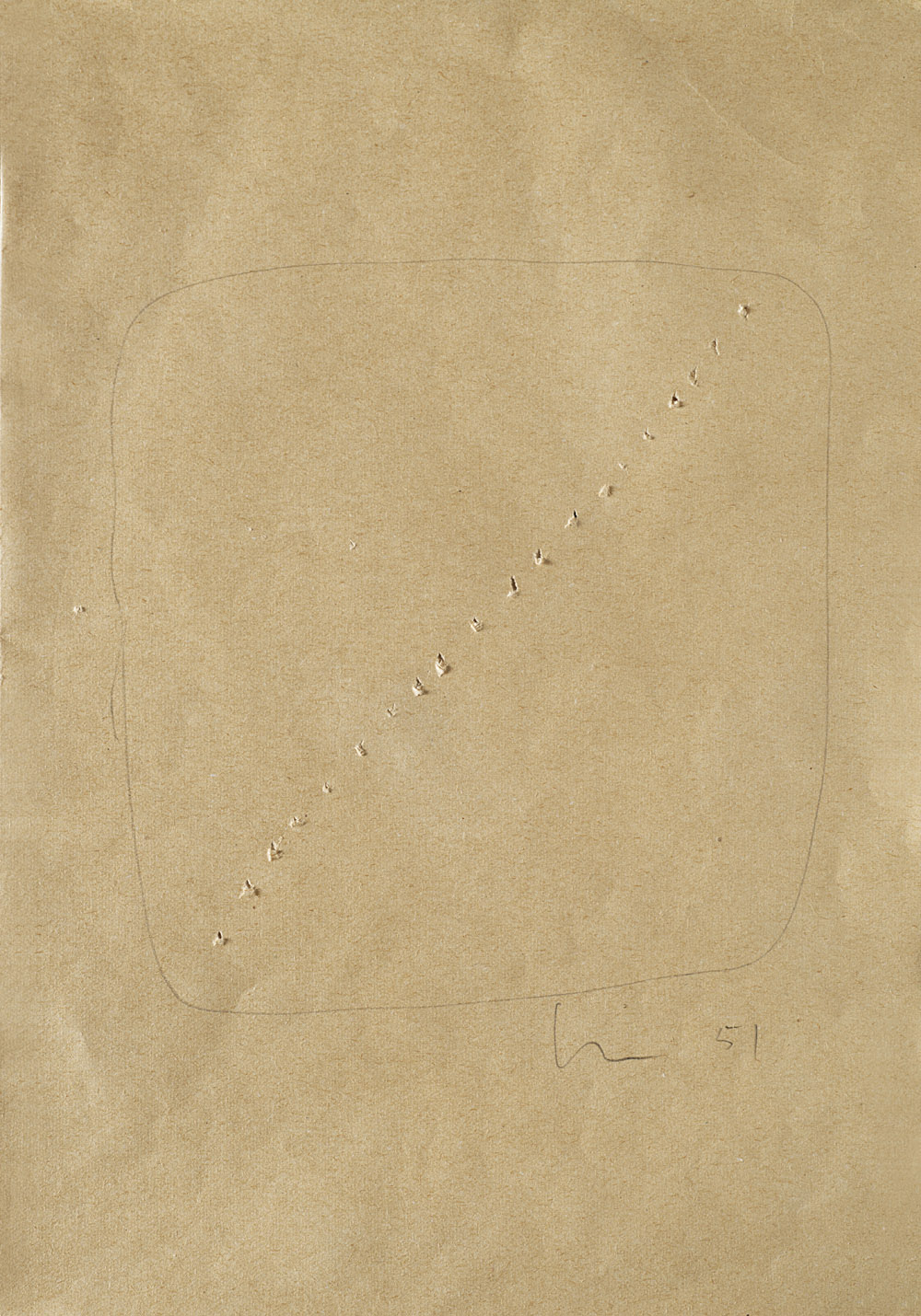 Lucio Fontana (Rosario Di Santa Fé 1899 - Comabbio 1968) - "Concetto spaziale" 1951 matita e buchi su carta, cm 26x22 Firmato e datato 51 in basso a destra Provenienza Collezione privata, Milano Bibliografia L. M. Barbero "Lucio Fontana - Catalogo Ragionato delle opere su carta" Tomo II, Milano, Skira, 2013, p. 574 n. 51 DSP 71 ill. Opera accompagnata da certificato di autenticità su fotografia rilasciato dall'Archivio Lucio Fontana, Milano, in data 20/02/1970 con il n. 38/1