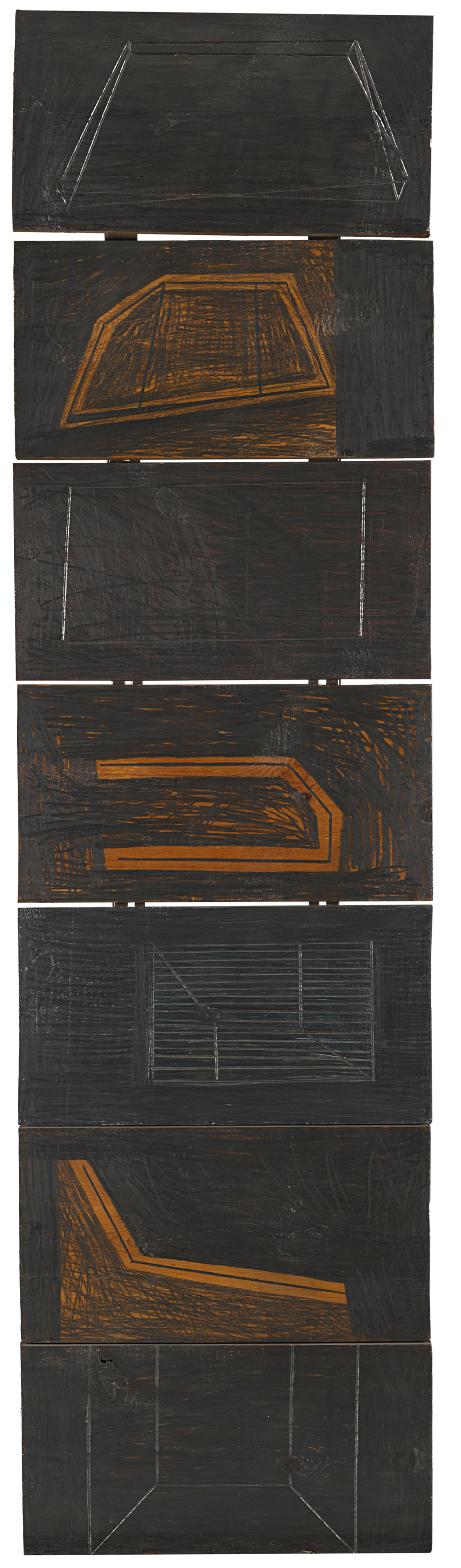 Pedro Calapez (Lisbona 1953) - "Senza titolo" 1988 scultura in legno in 7 elementi e tecnica mista, cm 149x40 Ogni elemento è firmato e datato 1988 al retro Provenienza Galleria EMI-Valentim de Carvalho, Lisbona Collezione privata, Milano