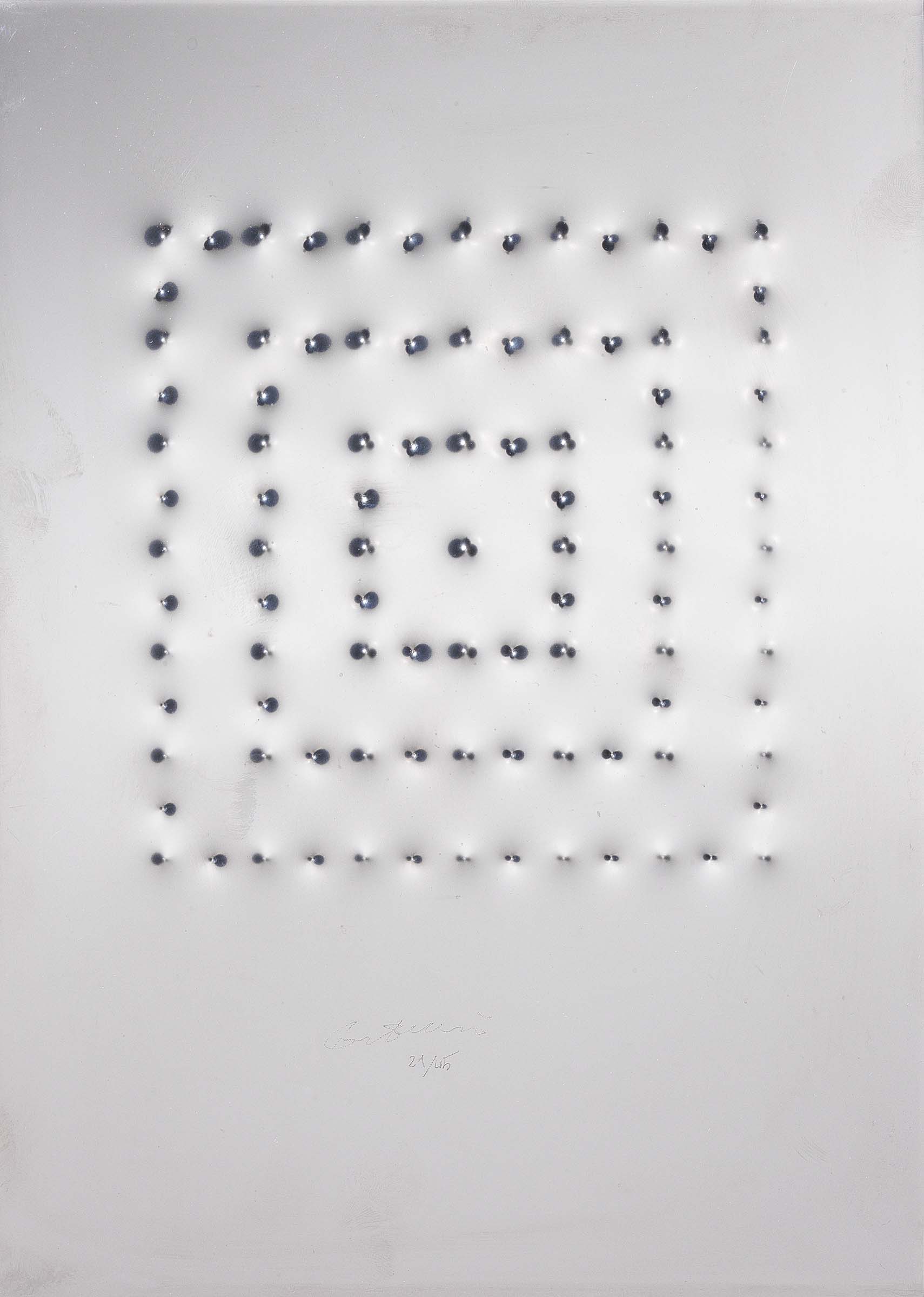Enrico Castellani Castelmassa (Ro) 1930 Senza titolo, 2006 Estroflessione su alluminio, es. 21/45, cm. 31x23,4 Firma e tiratura in basso al centro: Castellani / 21/45. Certificato su foto Elite Trading, Milano. L'opera è accompagnata dal volume Vola, alta, parola, vent'anni di Edizioni Colophon, catalogo della mostra, Firenze, Biblioteca Nazionale, 28 marzo - 19 aprile 2008.