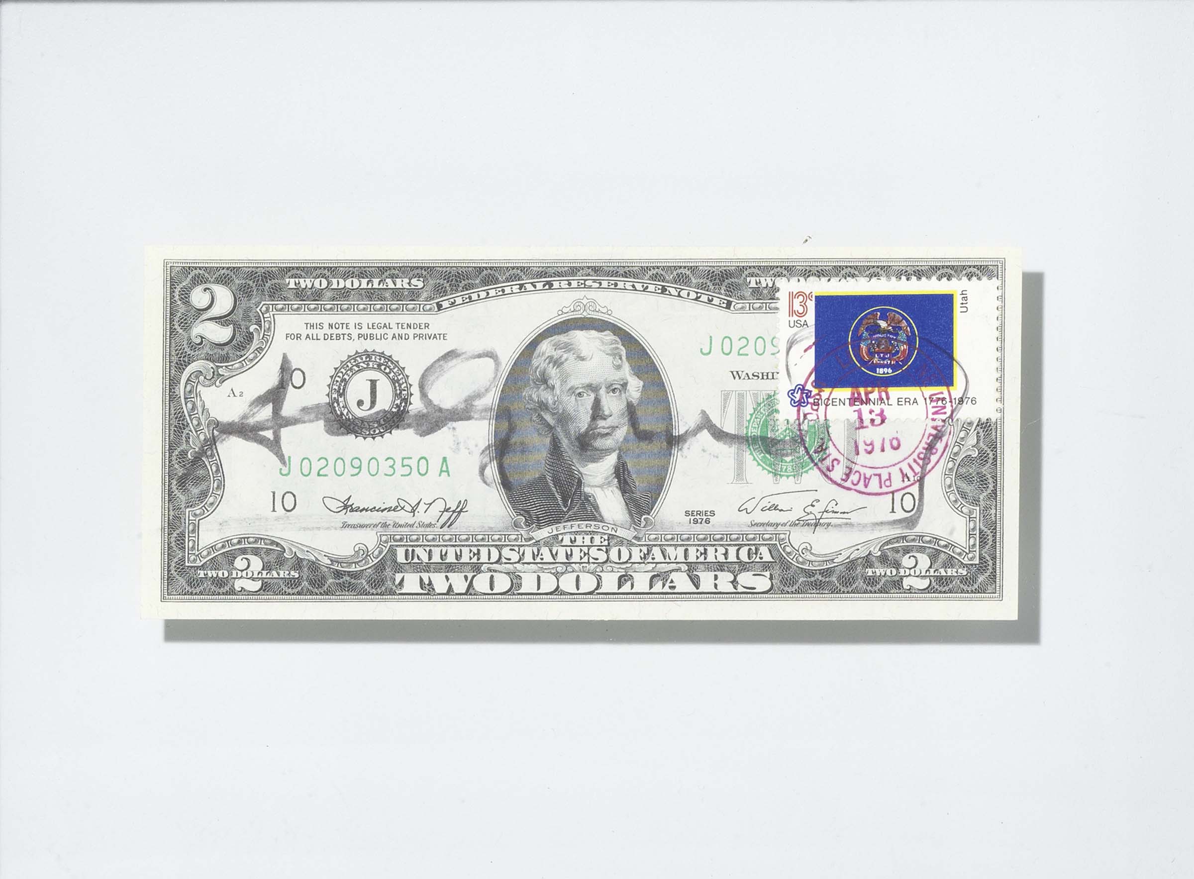 Andy Warhol Pittsburgh 1928 - New York 1987 Two dollars Jefferson Tecnica mista su banconota, cm. 6,6x15,5 Firma al centro: Andy Warhol: timbro postale con data 13 Apr. 1976; al verso: timbro Andy Warhol.