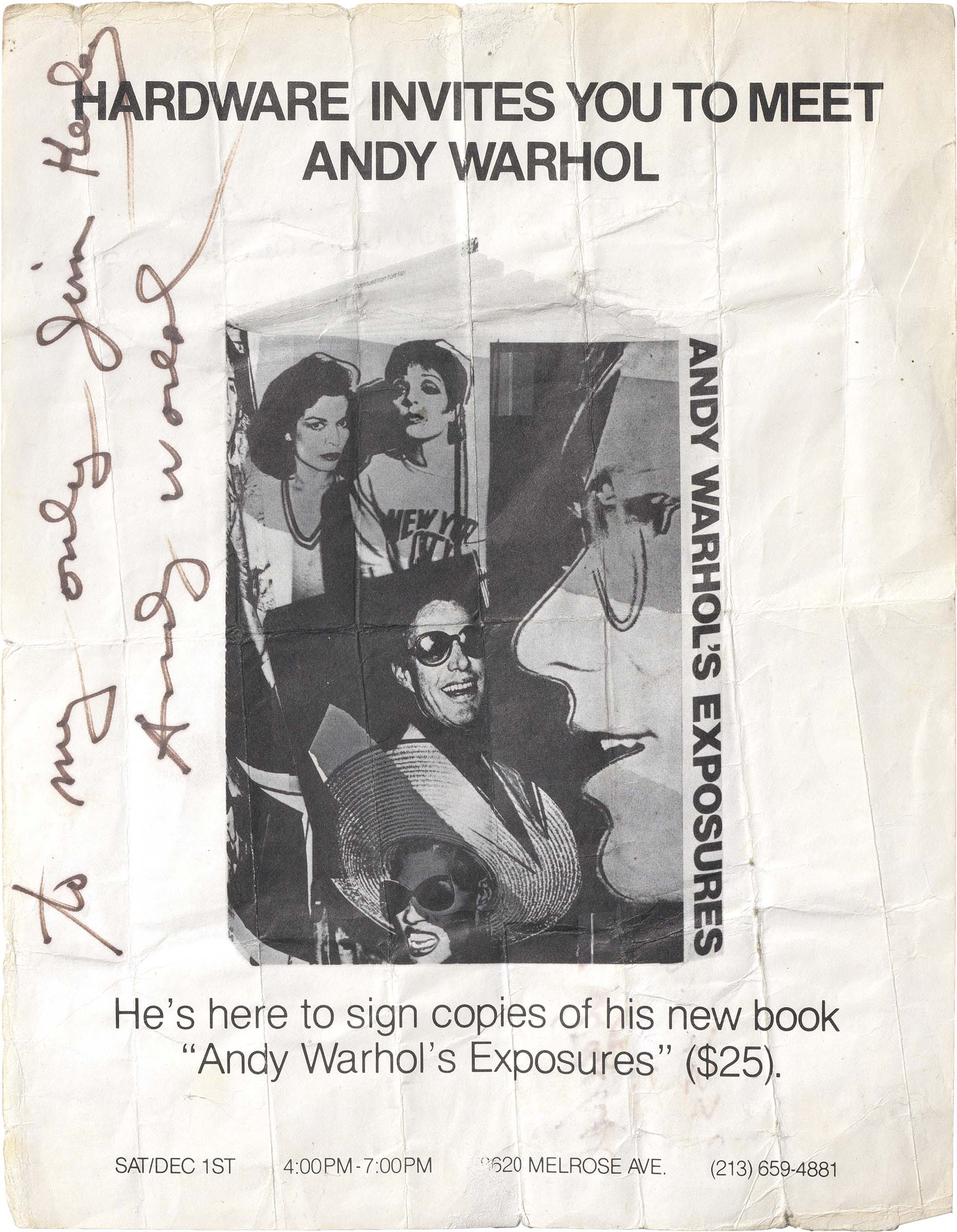 Andy Warhol Pittsburgh 1928 - New York 1987 Invito alla presentazione di «Andy Warhol Exposure's» Biglietto d'invito, cm. 27,8x21 Dedica e firma sul lato sinistro: To my only [...] / Andy Warhol.