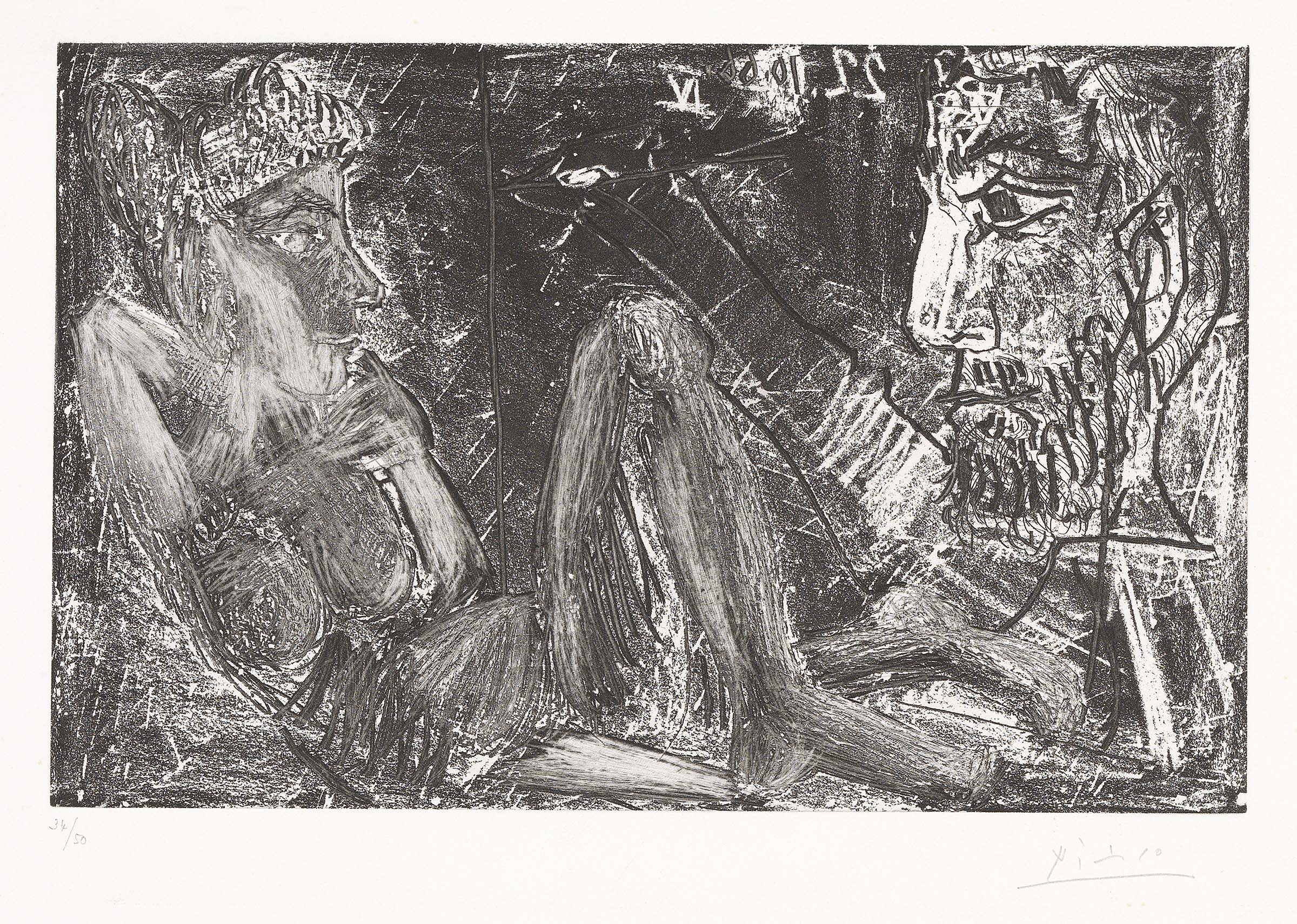 Pablo Picasso Malaga 1881 - Mougins 1973 Homme et Femme, 1968 Acquaforte e acquatinta, es. 34/50, cm. 24,6x38 (lastra), cm. 39x49 (carta) Firma a matita sul margine in basso a destra: Picasso, tiratura in basso a sinistra: 34/50. Bibliografia: Georges Bloch, Pablo Picasso. Tome I. Catalogue de l'oeuvre gravé et lithographié 1904-1967, IV edizione, (I edizione 1968), Kornfeld et Cie, Berna, 1984, p. 301, n. 1385.