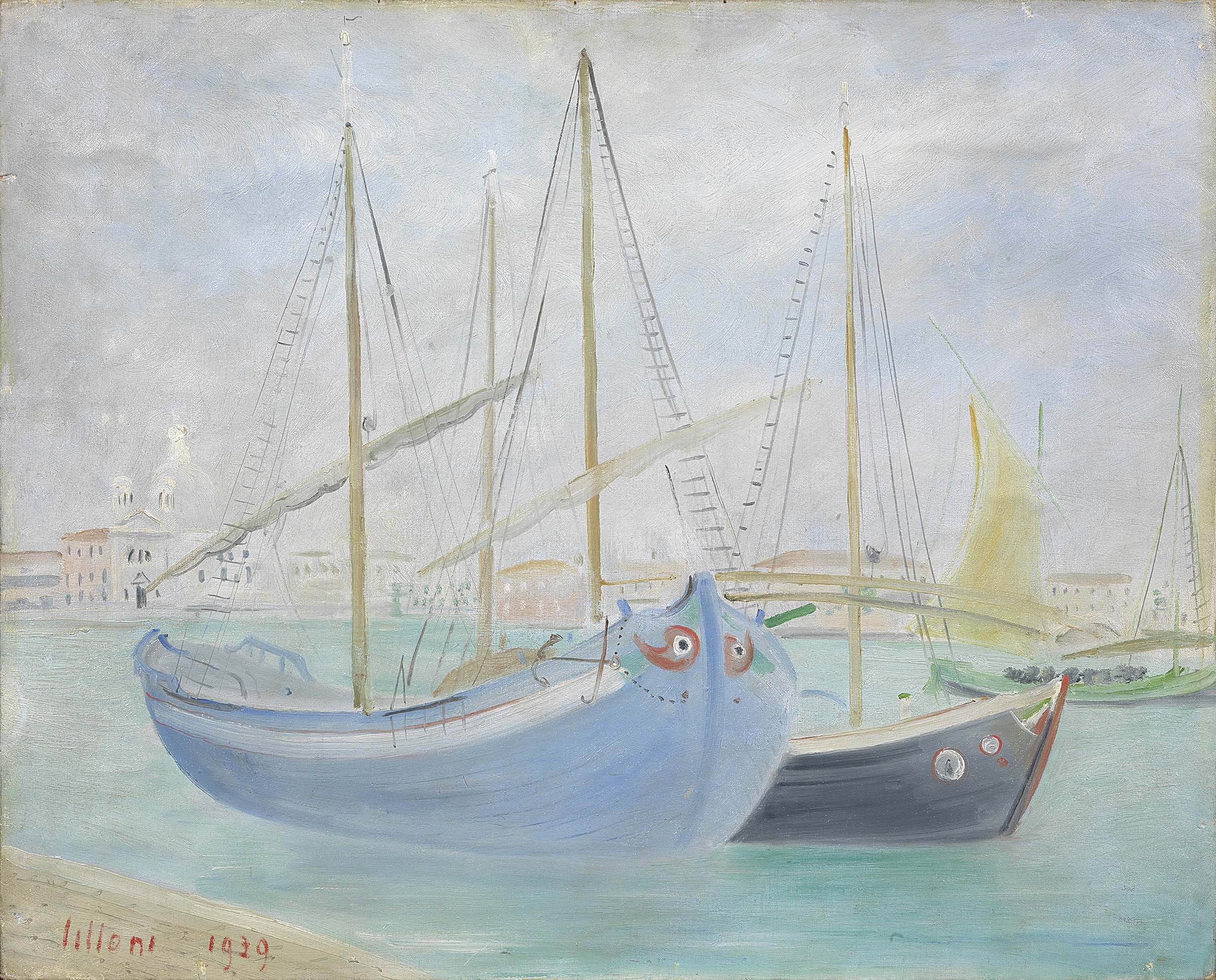 Umberto Lilloni Milano 1898 - 1980 Vele a Venezia, 1939 Olio cartone telato, cm. 46,8x57,8 Firma e data in basso a sinistra: Lilloni 1939. Al verso: etichetta e tre timbri Raccolta N. Mobilio, Firenze.