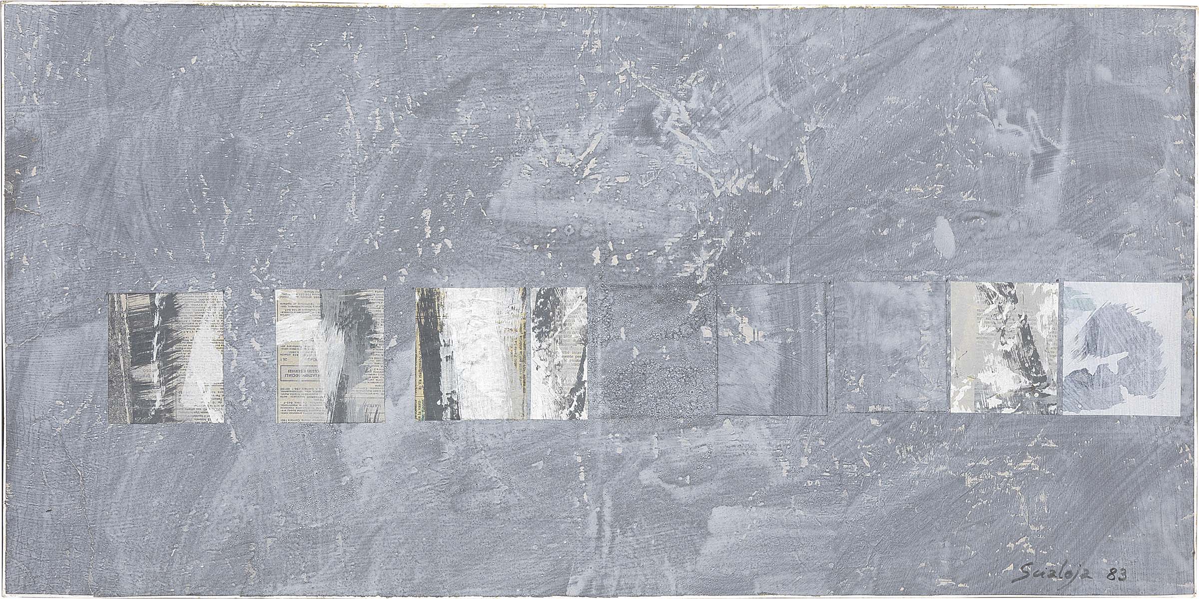 Toti Scialoja Roma 1914 - 1998 Senza titolo, 1983 Tecnica mista e collage su carta applicata su cartoncino, cm. 40x81 Firma e data in basso a destra: Scialoja 83.