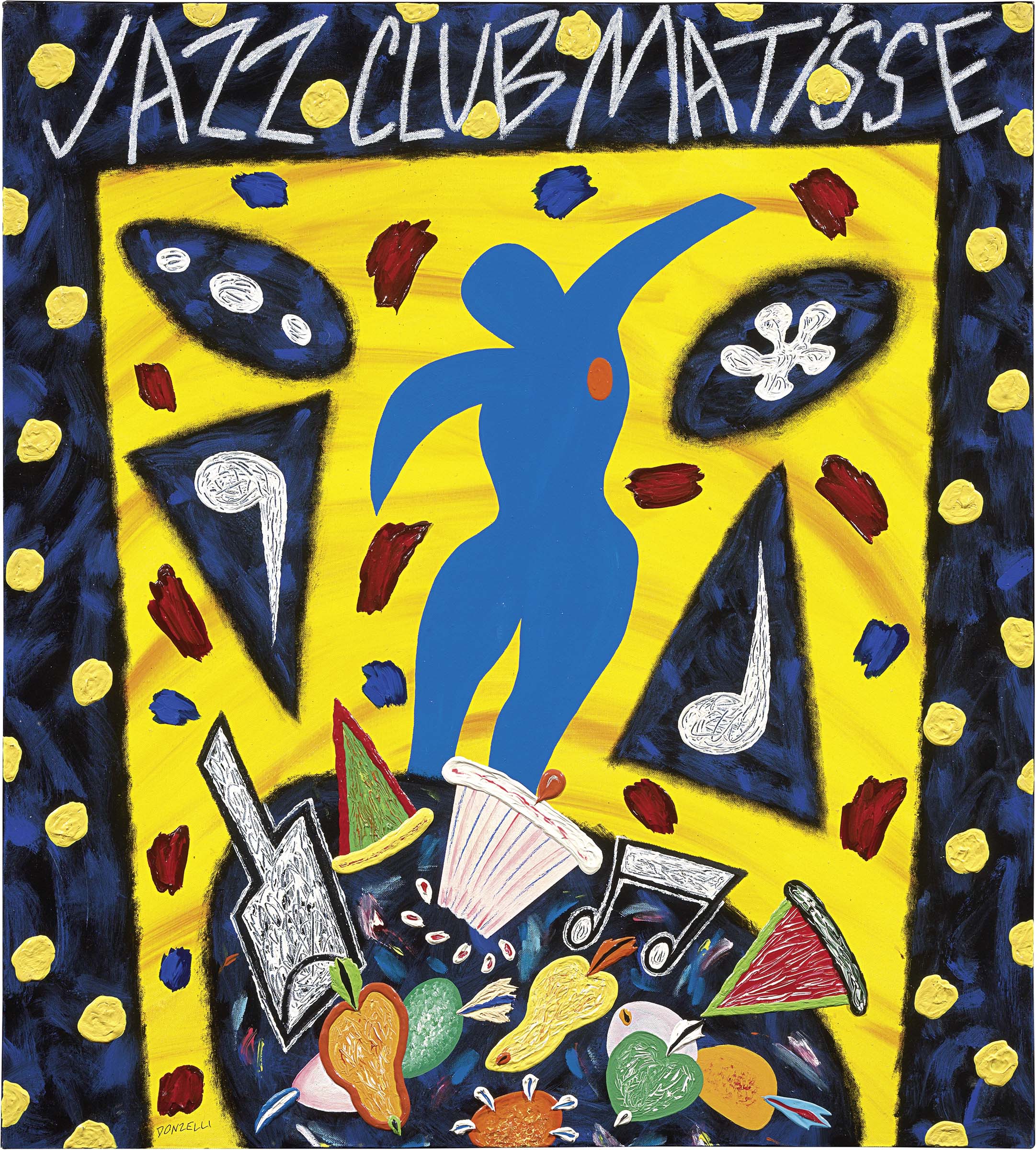Bruno Donzelli Napoli 1941 Jazz Club Matisse, 1999 Tecnica mista su tela, cm. 100x90 Firma in basso a sinistra: Donzelli; firma e titolo al verso sulla tela: Bruno Donzelli / "Jazz Club Matisse"; sul telaio data: 1999. Foto autenticata dall'artista; certificato su foto Fondazione Bruno Donzelli, Napoli, 21/6/10, con n. 1055/10, firmato dall'artista. Bibliografia: Bruno Donzelli dagli anni Ottanta al Duemila, Edizioni Giovanni Di Summa, Roma, 2000, p. n.n.