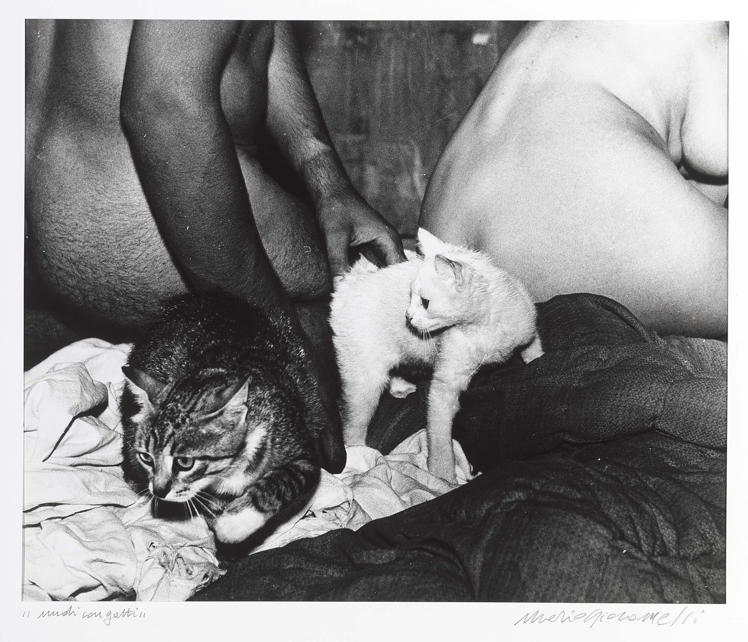 Mario Giacomelli Senigallia (An) 1925 - 2000 Nudi con gatti Stampa alla gelatina ai sali d'argento, cm. 50,5x60,5 Titolo e firma su un passepartout: "Nudi con gatti" / Mario Giacomelli; firma al verso: Mario Giacomelli: timbro Copyright Eredi Mario Giacomelli / Impronta di Garanzia / Copia originale scattata - sviluppata - stampata da / Mario Giacomelli.