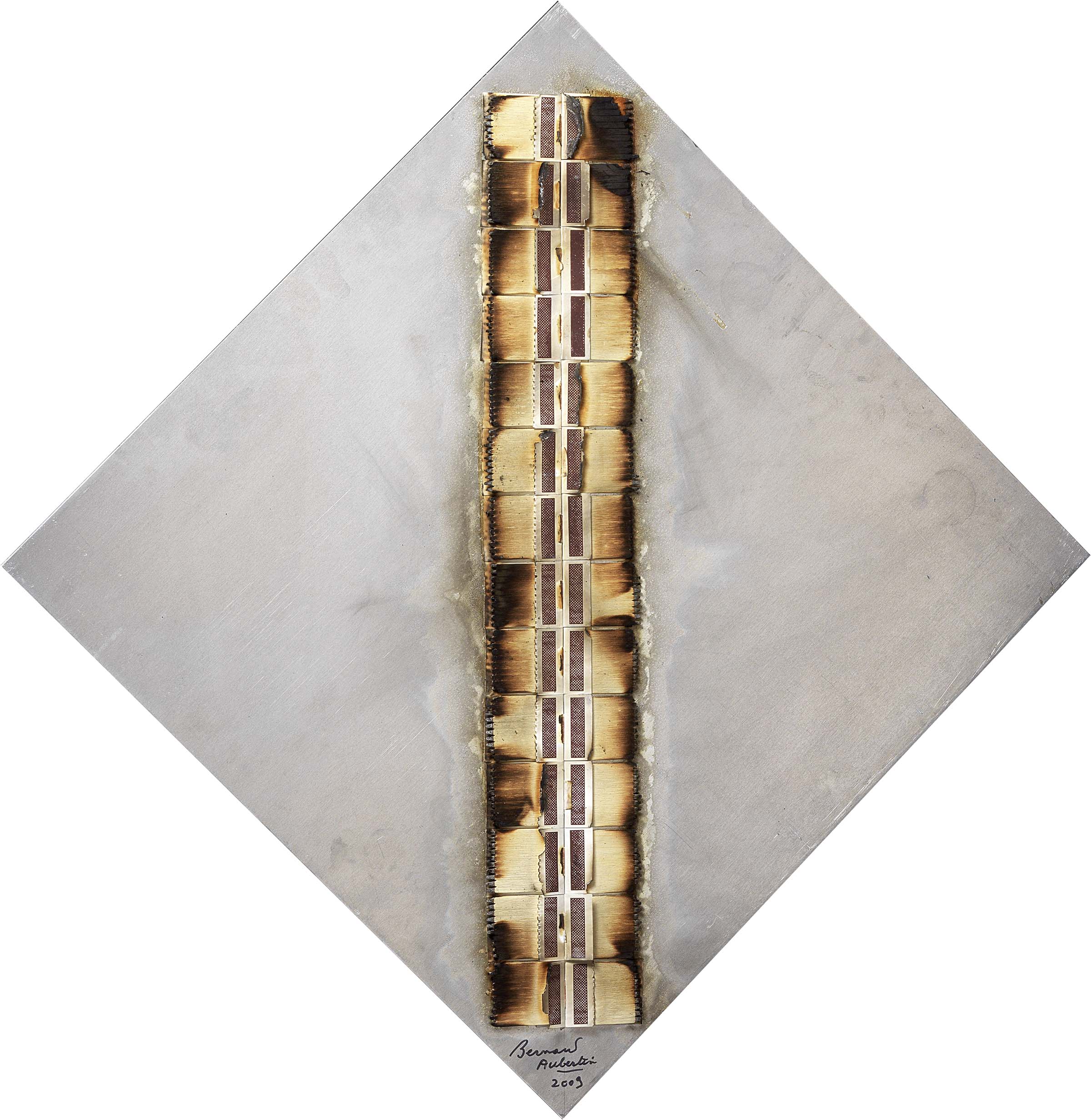 Bernard Aubertin Fontenay-aux-Roses 1934 Dessin de feu, 2009 Fiammiferi bruciati su alluminio, cm. 71x71 Firma e data in basso a sinistra: Bernard / Aubertin / 2009; dedica, firma e data al verso: Für [...] / von / Bernard Aubertin / 15-03-2011. Foto autenticata dall'artista. Esposizioni: L'autenticità dell'opera è stata confermata dall'Archivio Aubertin, Brescia.