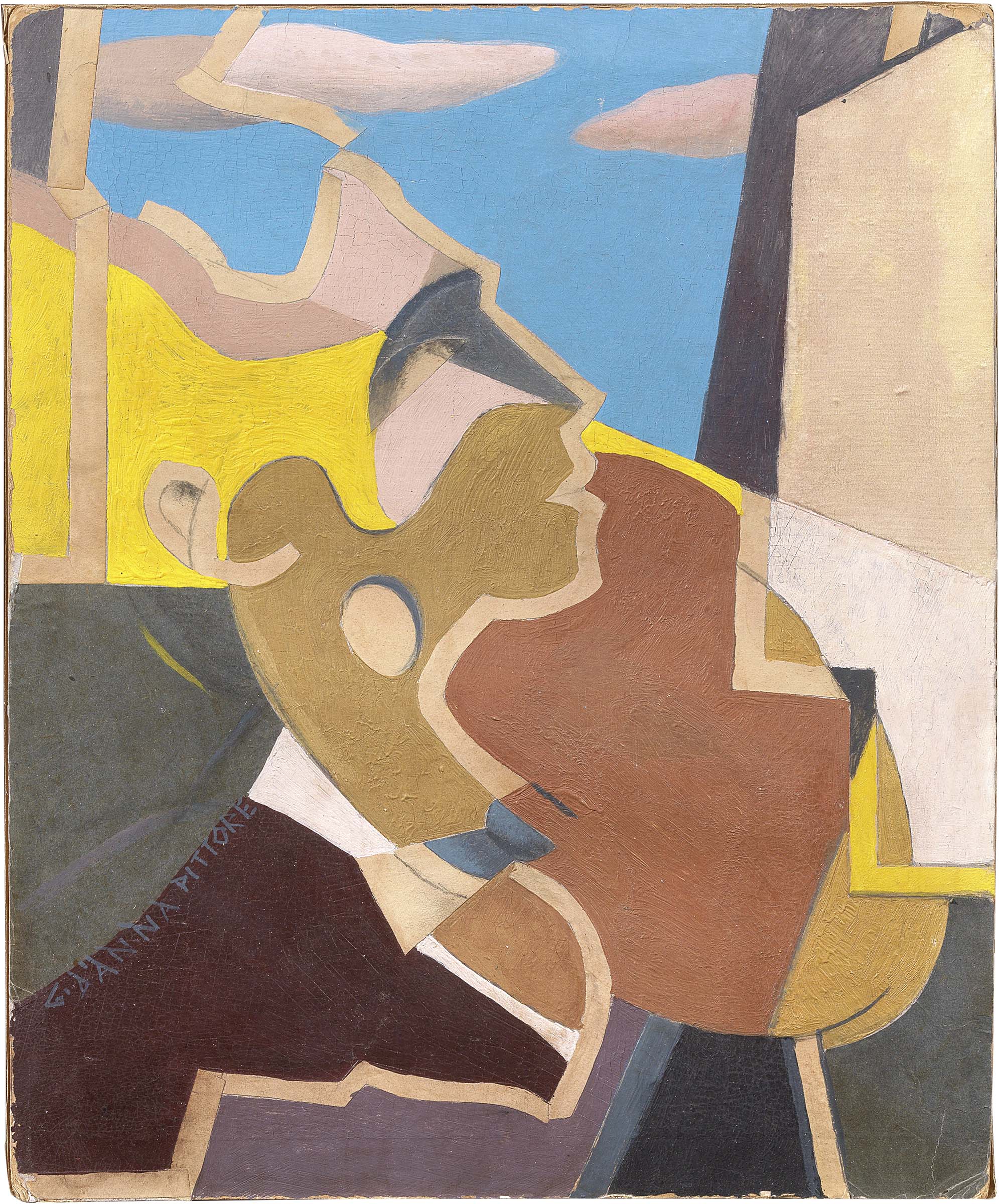 Giulio D'Anna Villarosa (En) 1908 - Messina 1978 Autoritratto tra le nuvole, 1933-34 ca. Olio su cartone, cm. 29,8x32,5 Firma in basso a sinistra: G. D'Anna Pittore. Certificato su foto Archivio Storico del Futuristi Siciliani, Palermo.