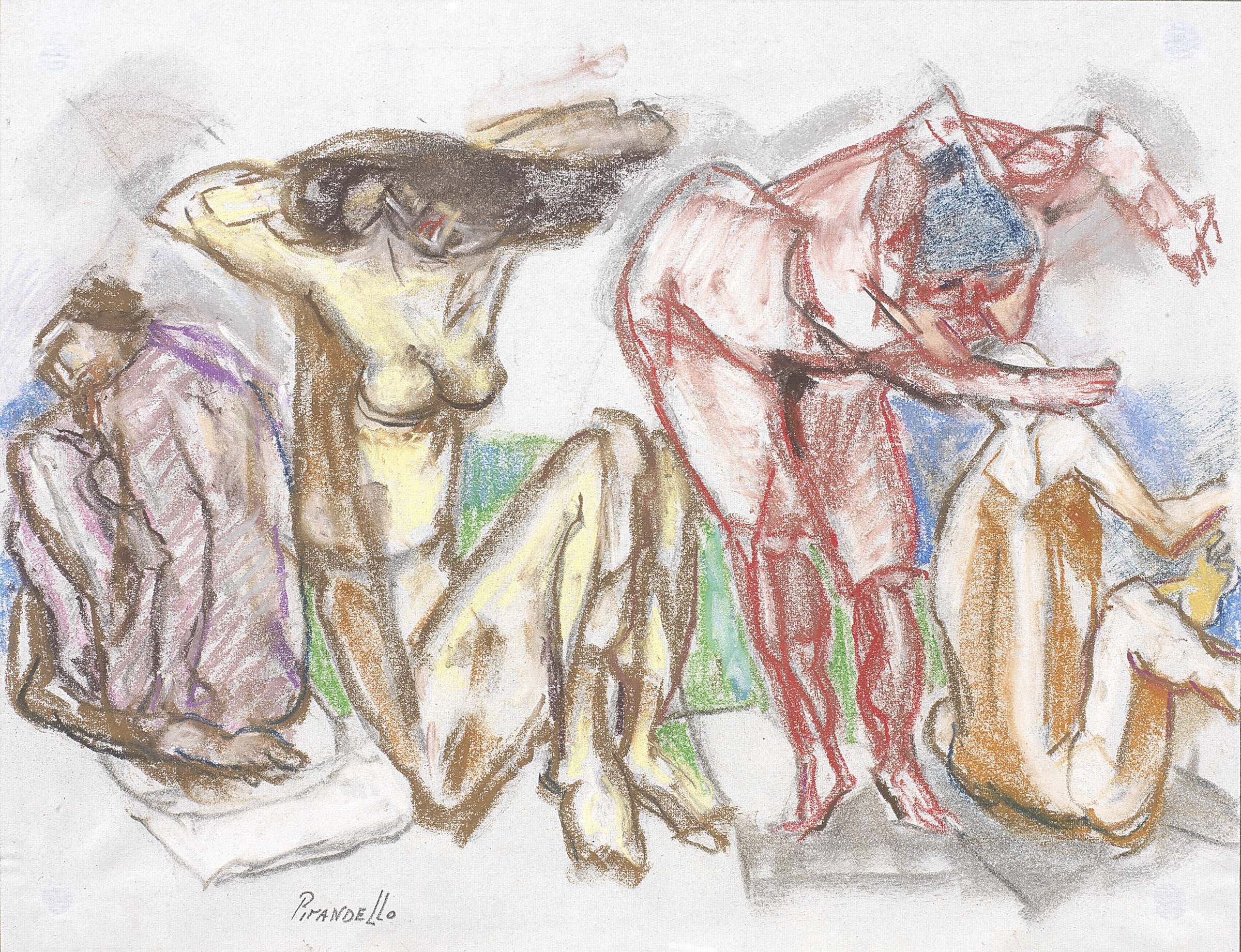 Fausto Pirandello Roma 1899 - 1975 Bagnanti Pastello su carta, cm. 21,8x28 Firma in basso a sinistra: Pirandello. Al verso su una carta di supporto alla cornice: etichetta Nuovo Vertice Galleria d'Arte Contemporanea, Roma.