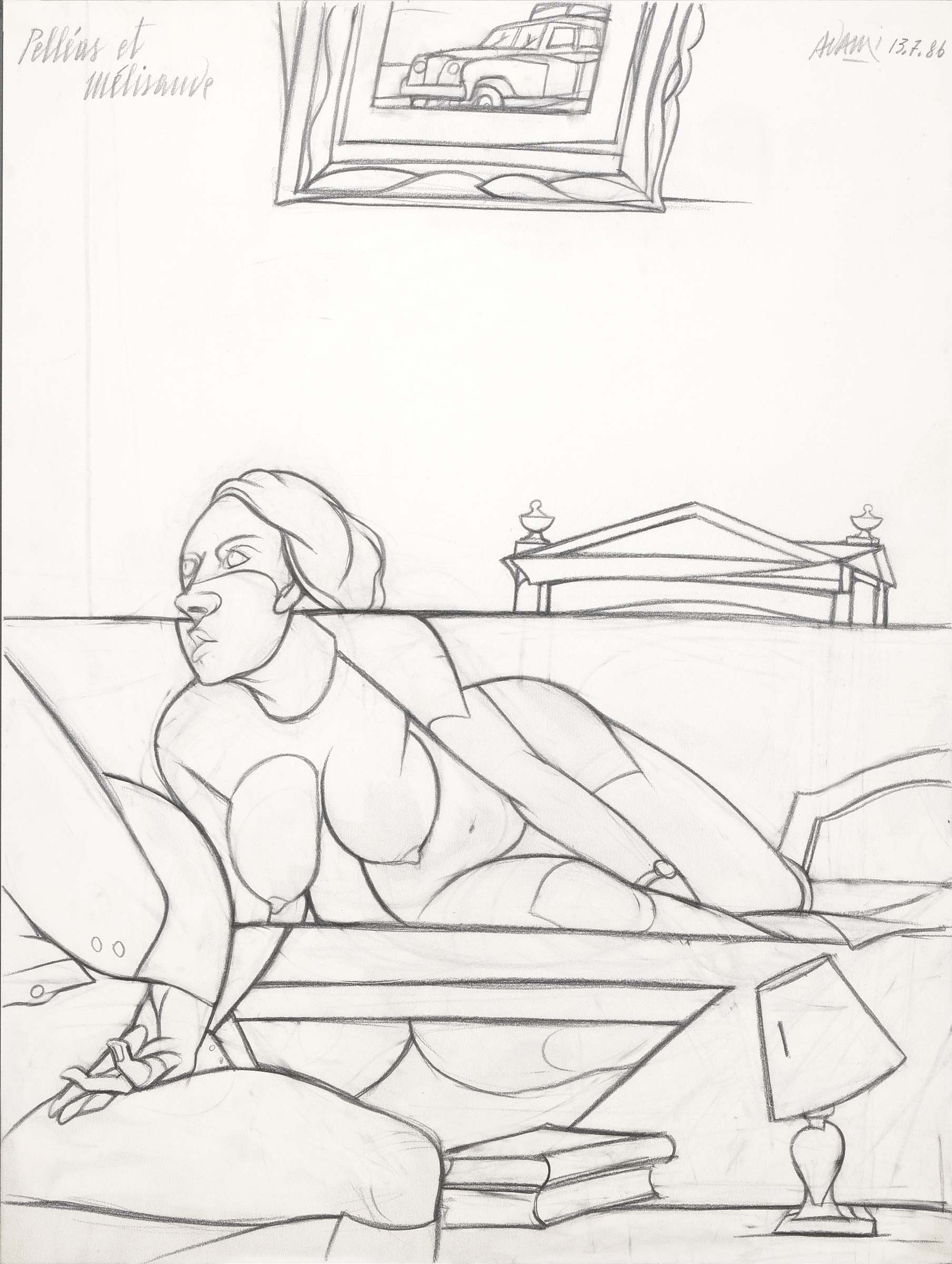 Valerio Adami Bologna 1935 Pelléus et Mélisande, 1986 Matita su carta, cm. 47,8x36 Firma e data in alto a destra: Adami 13.7.86, titolo in alto a sinistra: Pelléus et Mélisande.