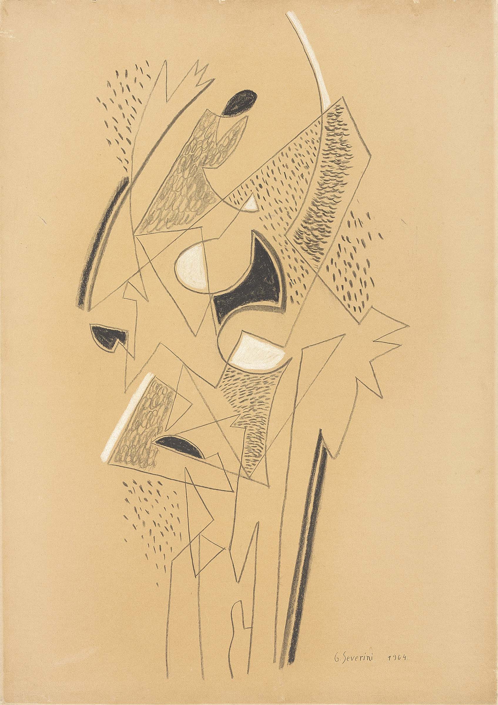 Gino Severini Cortona (Ar) 1883 - Parigi 1966 Danzatrice, 1964 Carboncino e pastelli su carta applicata su tela, cm. 70x49 Firma e data in basso a destra: G. Severini 1964. Al verso sulla tela: sigla G.S.F. (Gina Severini Franchina) / Roma / Aut. 11 nov. 69: etichetta e timbro Galleria Annunciata, Milano, con n. 6818. Certificato su foto di Gina Severini Franchina, Roma 11 nov. 1969 (in fotocopia); dichiarazione di autenticità di Bruno Grossetti, Galleria Annunciata, Milano, 29 novembre 1969.