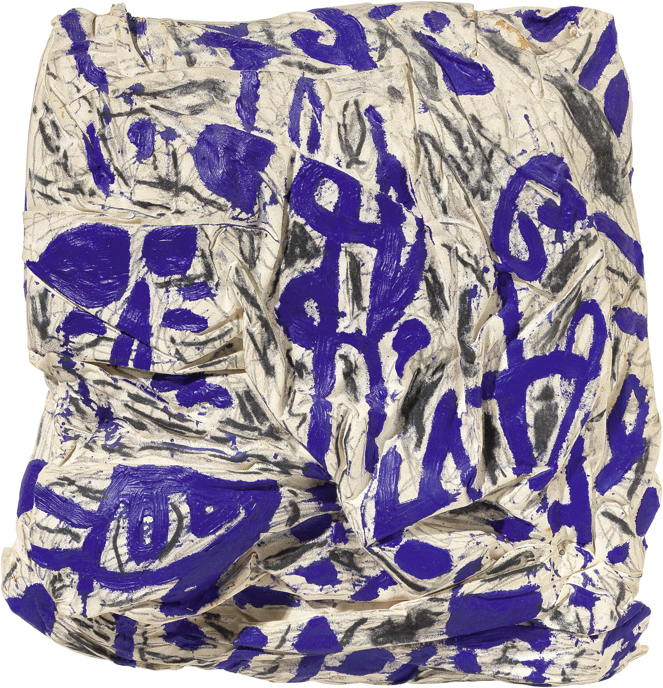 Cesare Berlingeri Cittanova (Rc) 1948 Primordiale, 2000 Carbone e acrilico su tela piegata, cm. 46,5x44x12,5 Firma, data, titolo e dedica al verso sulla tela: Berlingeri 2000 / "Primordiale" / Per [...] che hanno scelto / i miei quadri un / grazie di cuore / Cesare Berlingeri: etichetta e timbro Telemarket, Milano. Certificato su foto Dante Vecchiato Galleria d'Arte, Archivio delle opere di Berlingeri, con n. B 1011-0195 (opera datata 2001).