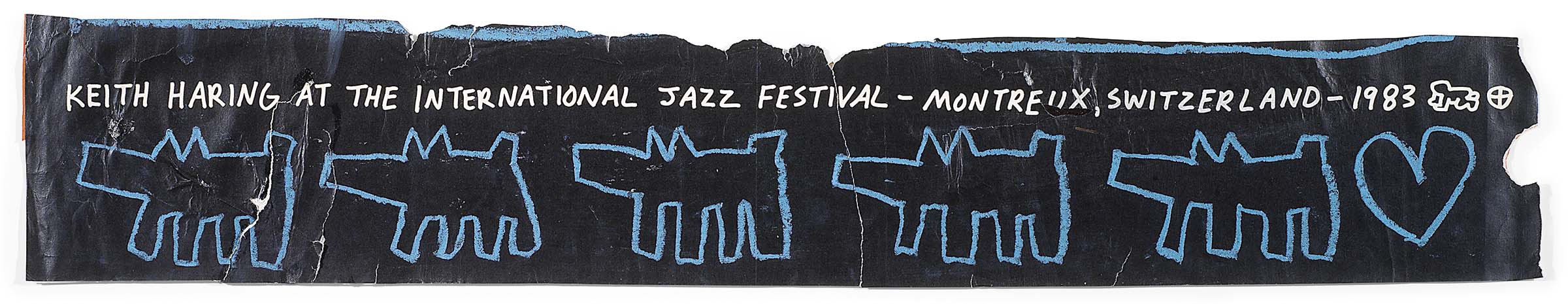 Keith Haring Kutztown 1958 - New York 1990 Senza titolo, 1983 Gessetto blu su carta nera, cm. 16,5x91 Certificato con foto The Estate of Keith Haring, New York, 14 luglio 2004, con n. 071404A10.