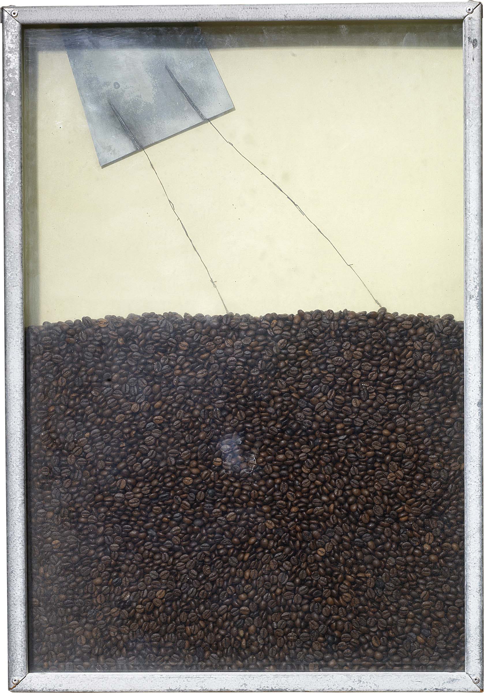 Jannis Kounellis Atene 1936 Senza titolo, (1989) Ferro, vetro, caffè, matita su carta e piombo, multiplo, es. 20/25, cm. 65,2x45,3x7,5 Firma e tiratura al verso: Kounellis / 20/25.