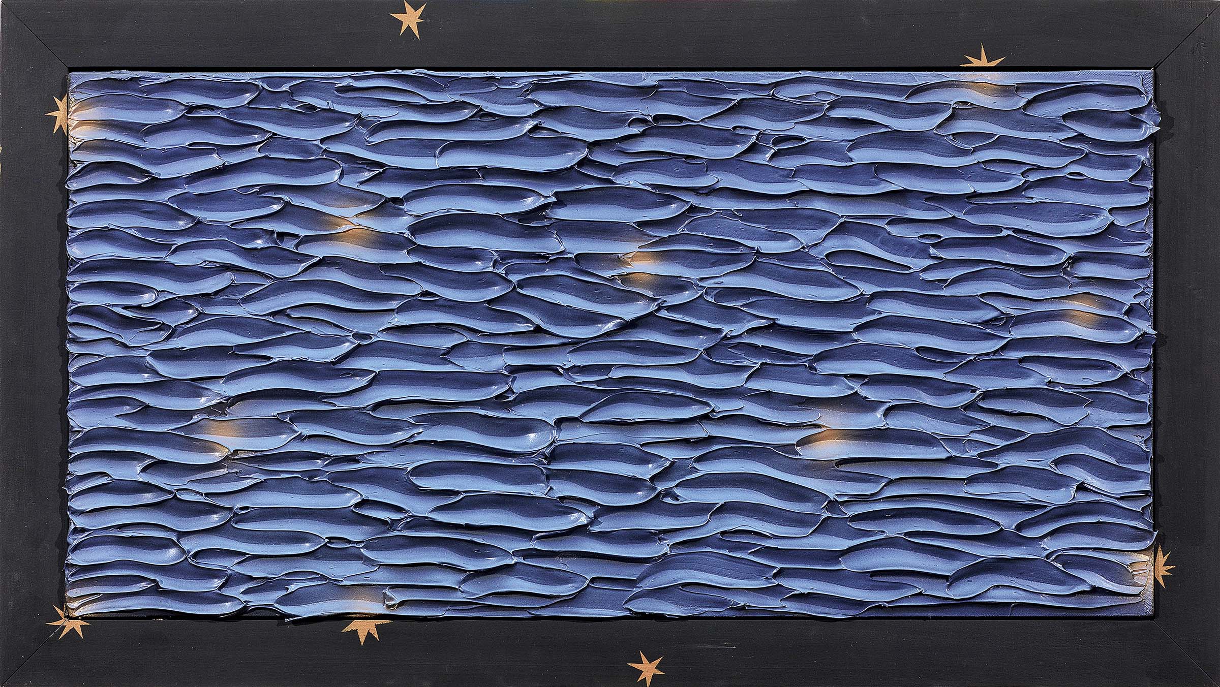 Jorrit Tornquist Graz 1938 Stars and Ocean, 1998 Tecnica mista su tela, cm. 50,5x90,5 (con cornice) Firma e data al verso sulla tela: Tornquist / 98; sul telaio: scritta Jorrit Tornquist - Stars and Ocean - 1998; sul telaio e sulla cornice: etichetta e due timbri Studio f. 22 Modern Art Gallery, Palazzolo sull'Oglio. Foto autenticata dall'artista con etichetta Studio f. 22 Modern Art Gallery, Palazzolo sull'Oglio.