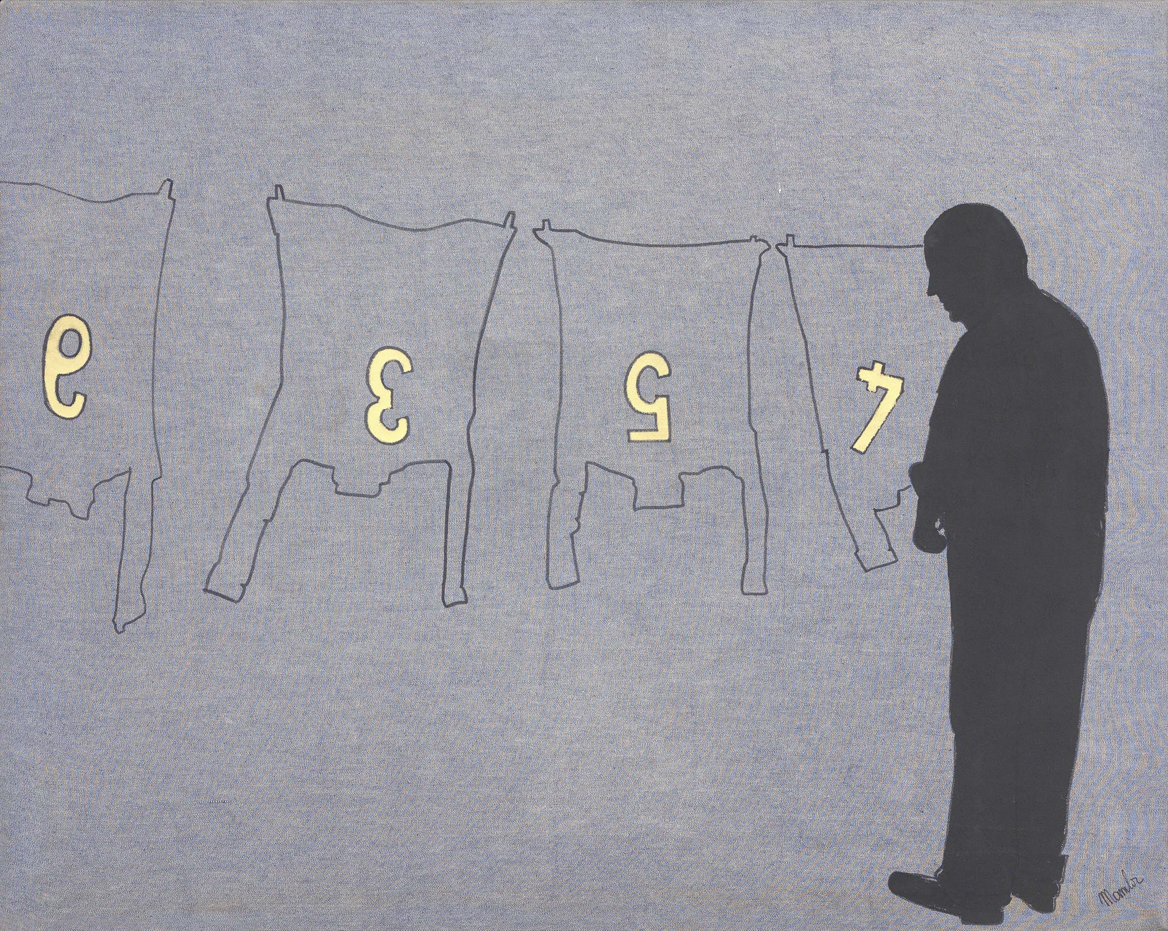 Renato Mambor Roma 1936 - 2014 Squadra in riposo, 1965 Acrilico su tela jeans, cm. 80x100,5 Firma in basso a destra: Mambor; firma e titolo al verso sul telaio: Mambor Squadra in riposo. Foto autenticata dall'artista.