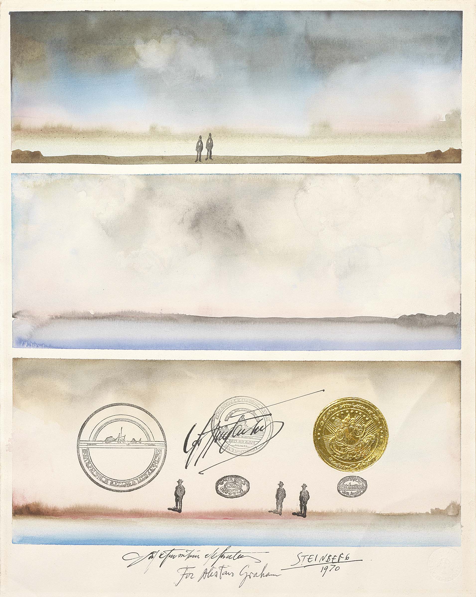 Saul Steinberg Ramnicul Sarat 1914 - New York 1999 Senza titolo, 1970 Acquerello e tecnica mista su carta, cm. 36,8x29 Dedica, firma e data in basso al centro: [...] / For Alistair Graham / Steinberg / 1970. Storia: Galerie Lelong, Parigi; Collezione privata