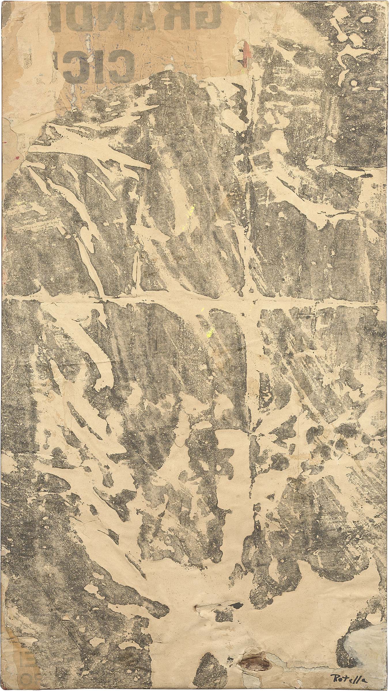 Mimmo Rotella Catanzaro 1918 - Milano 2006 Bianco e nero, fine anni Cinquanta Retro d'affiche su tela, cm. 72x40 Firma in basso a destra e al verso sulla tela: Rotella; sul telaio titolo: Bianco e nero: etichetta con dati dell'opera: timbro Galleria La Salita, Roma. Storia: Galleria La Salita, Roma; Collezione privata Foto autenticata dall'artista; opera in fase di archiviazione presso la Fondazione Mimmo Rotella.