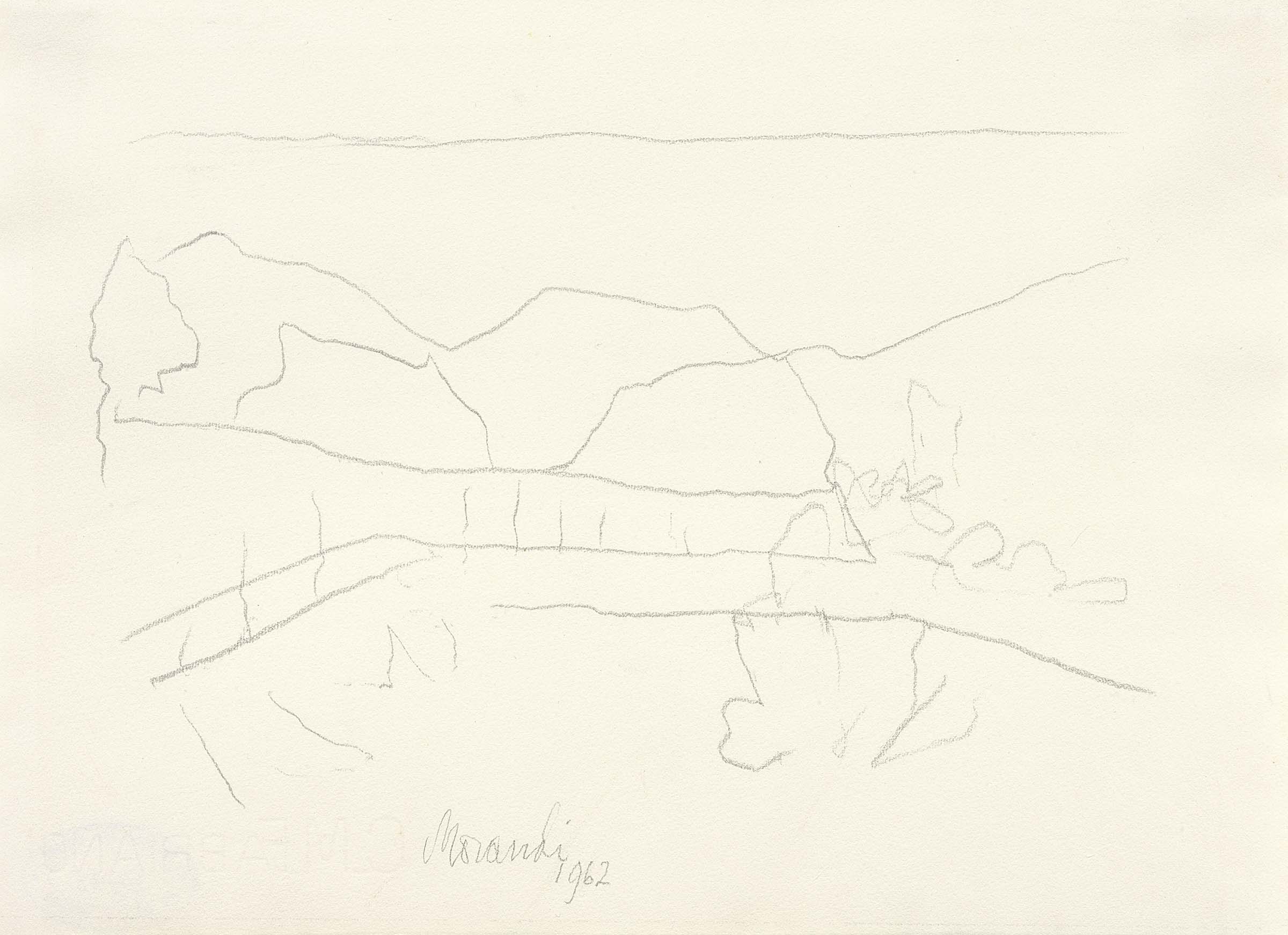 Giorgio Morandi Bologna 1890 - 1964 Paesaggio, 1962 Matita su carta, cm. 24,2x33,2 Firma e data in basso al centro: Morandi / 1962. Al verso: timbro Galleria del Milione, Milano, con n. 9933. Storia Collezione privata, Milano; Collezione privata Esposizioni Morandi, 100 opere su carta, Milano, Pinacoteca di Brera, 30 novembre 1985 - 2 febbraio 1986, cat. p. 80, n. 63, illustrata; Giorgio Morandi, mostra itinerante in Giappone, novembre 1989 - maggio 1990, cat. p. 136, n. 111, illustrata. Bibliografia Efrem Tavoni, Marilena Pasquali, Morandi disegni. Catalogo generale, Electa, Milano, 1994, p. 236, n. 1962 101.