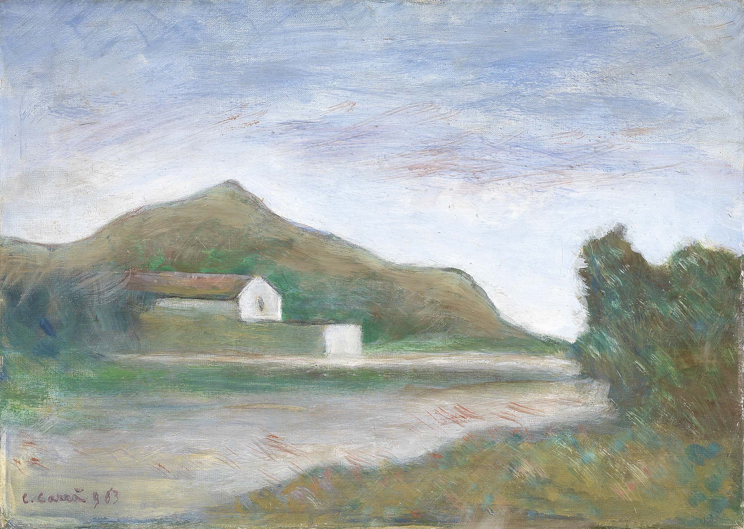 Carlo Carrà Quargnento (Al) 1881 - Milano 1966 Casa in Brianza, 1963 Olio su tela, cm. 50x70,5 Firma e data in basso a sinistra: C. Carrà 963. Al verso sulla tela: due timbri Galleria Gissi, Torino: etichetta Galleria Gissi, Torino / Omaggio a / Carrà, con n. 36: due timbri Galleria Cafiso, Milano: timbro Galleria d'Arte Di Pietro, Alba Adriatica: timbro Galleria La Tavolozza, Riccione: timbro Lo Scalino, Roma. Storia Collezione Carrà, Milano; Collezione privata Certificato su foto di Massimo Carrà, in data 14.11.89. Esposizioni Omaggio a Carrà. Dalla poetica futurista ai valori della realtà, Torino, Galleria Gissi, novembre 1969, cat. n. 36, illustrato a colori. Bibliografia Massimo Carrà, Carrà, tutta l'opera pittorica volume III, 1951-1966, L'Annunciata / La Conchiglia, Milano, 1968, pp. 501, 586, n. 16/63.