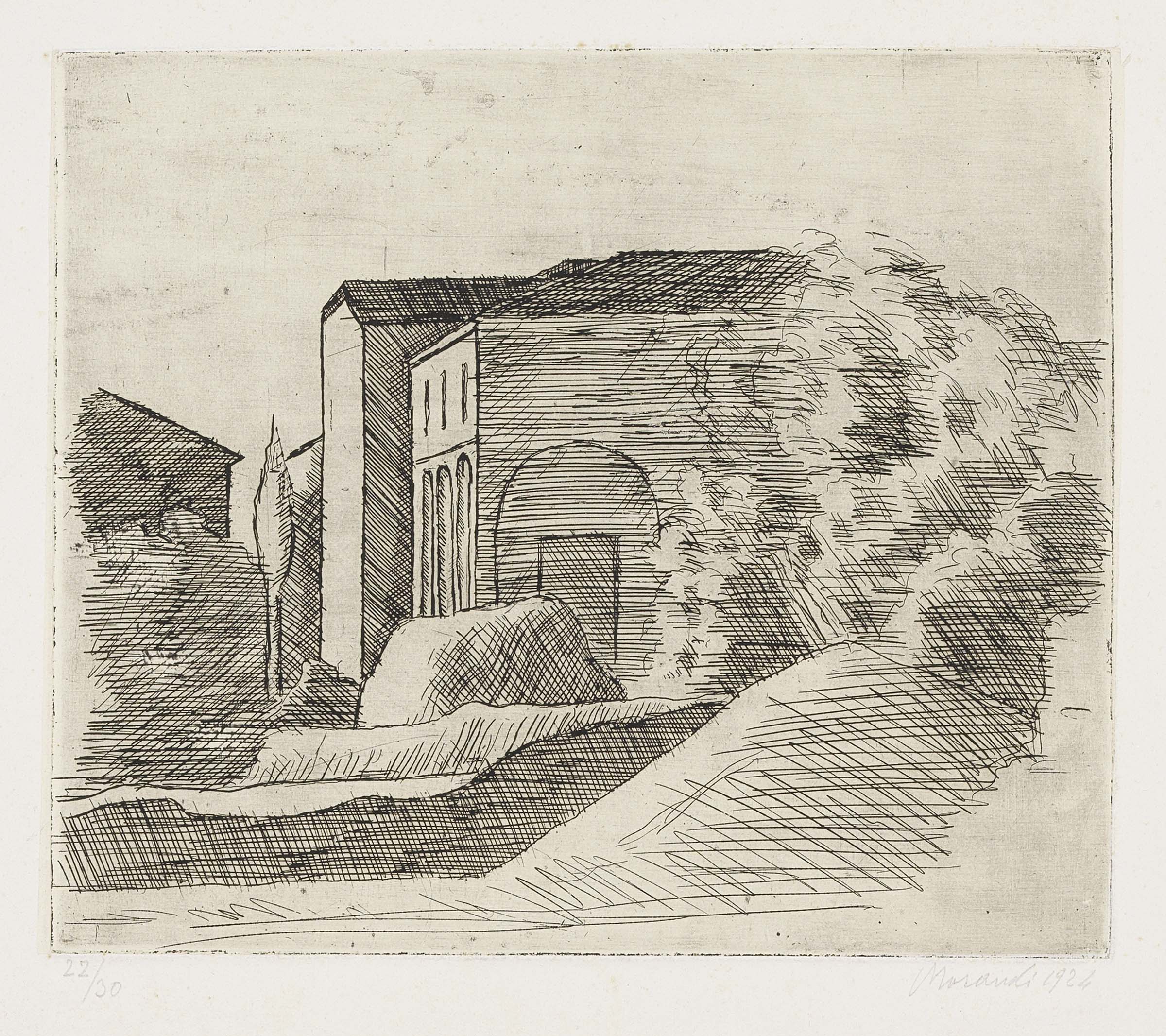 Giorgio Morandi Bologna 1890 - 1964 La casetta con il portico e il cipresso (lastra grande), 1924 Acquaforte su zinco, es. 22/30, cm. 20,1x23,5 (lastra), cm. 28x43,8 (carta) Firma e data a matita sul margine in basso a destra: Morandi 1924, in basso a sinistra tiratura: 22/30. Primo stato su due; tiratura 30 esemplari numerati e due prove di stampa. Bibliografia Lamberto Vitali, L'opera grafica di Giorgio Morandi, Giulio Einaudi Editore, Torino, 1964, n. 21; Michele Cordaro, Morandi incisioni. Catalogo Generale, Edizioni Electa, Milano, 1991, p. 22, n. 1924 1.