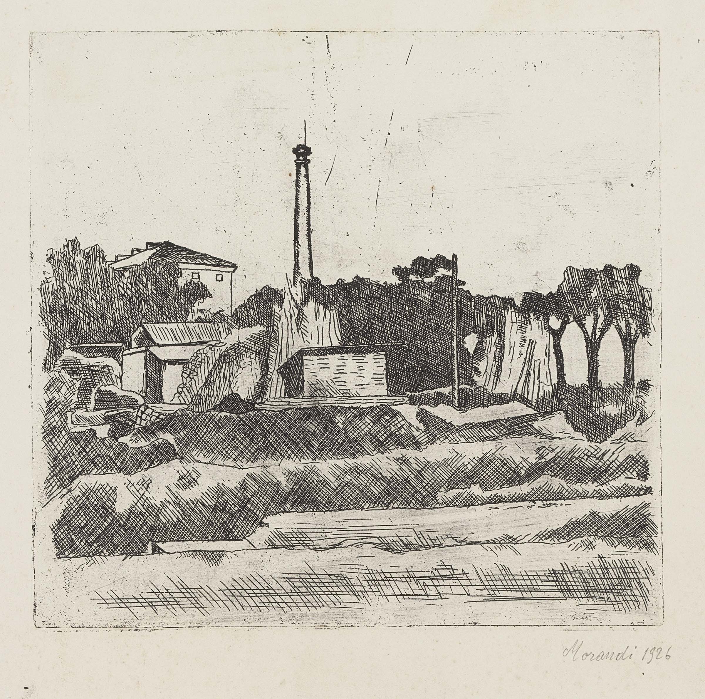 Giorgio Morandi Bologna 1890 - 1964 Paesaggio con la ciminiera (Sobborghi di Bologna), 1926 Acquaforte su zinco, cm. 22,7x24,1 (lastra), cm. 30,5x36 (carta) Firma e data a matita sul margine in basso a destra: Morandi 1926. Primo stato su due; tiratura di alcuni esemplari non numerati. Bibliografia Lamberto Vitali, L'opera grafica di Giorgio Morandi, Giulio Einaudi Editore, Torino, 1964, n. 27; Michele Cordaro, Morandi incisioni. Catalogo Generale, Edizioni Electa, Milano, 1991, p. 31, n. 1926 1.