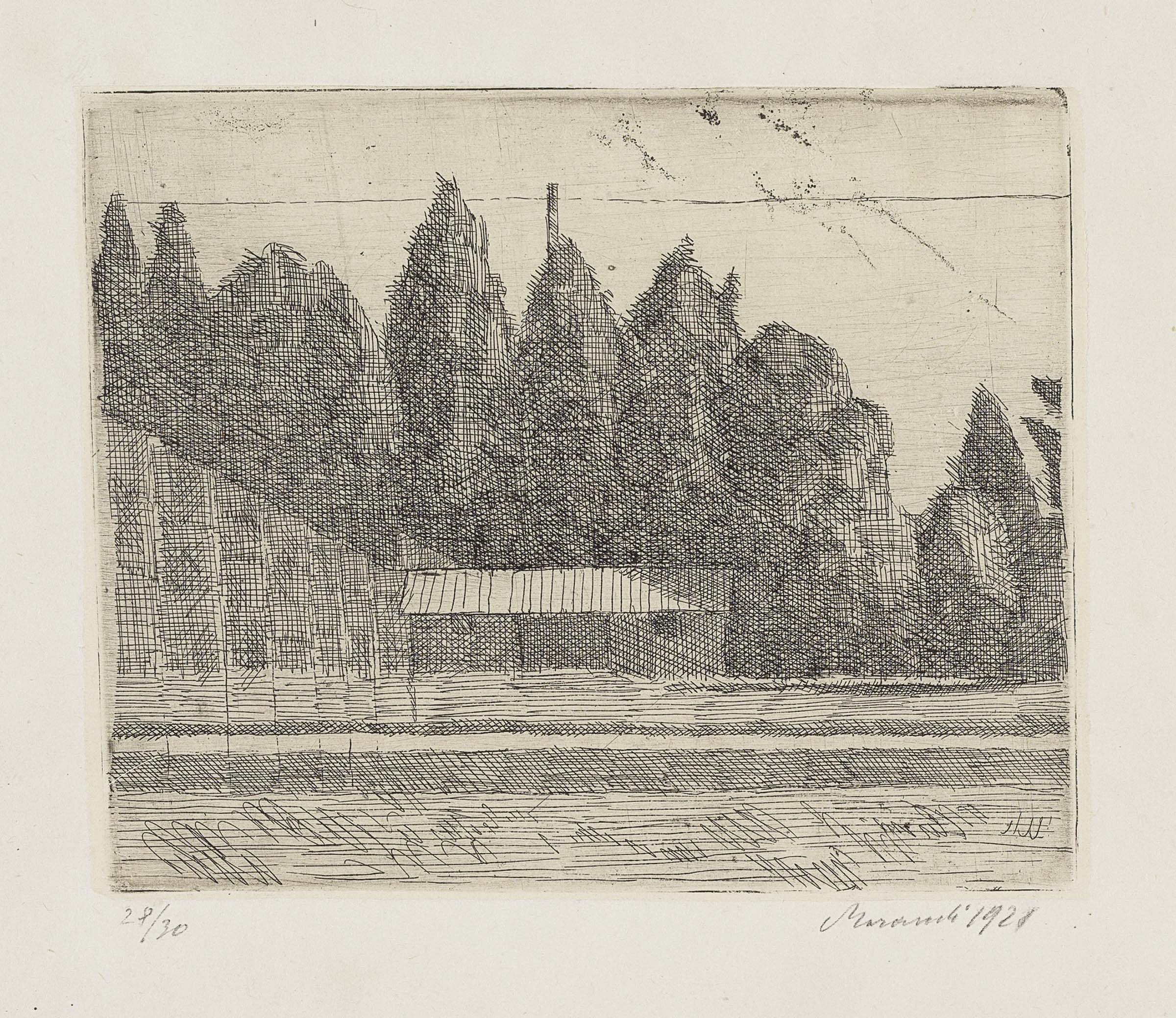 Giorgio Morandi Bologna 1890 - 1964 Campo di tennis ai Giardini Margherita a Bologna (lastra piccola), 1921 Acquaforte su zinco, es. 28/30, cm. 11,3x13,6 (lastra), cm. 18,5x25,5 (carta) Firma e data a matita sul margine in basso a destra: Morandi 1921, tiratura in basso a sinistra: 28/30. Primo stato su due. Tiratura di 30 esemplari numerati e qualche prova di stampa. Bibliografia Lamberto Vitali, L'opera grafica di Giorgio Morandi, Giulio Einaudi Editore, Torino, 1964, n. 11; Michele Cordaro, Morandi incisioni. Catalogo Generale, Edizioni Electa, Milano, 1991, p. 11, n. 1921 6.