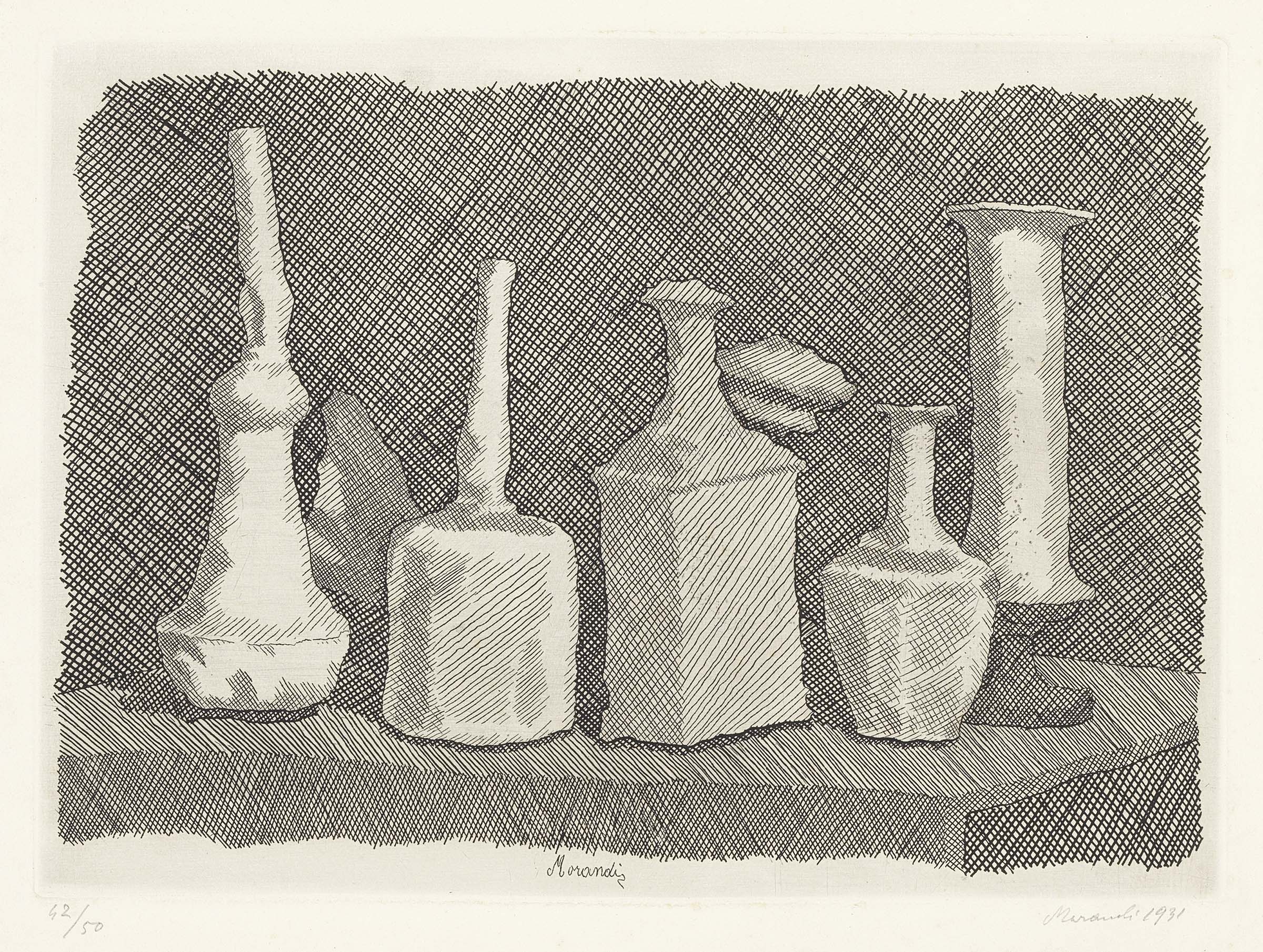 Giorgio Morandi Bologna 1890 - 1964 Natura morta a grandi segni, 1931 Acquaforte su zinco, es. 42/50, cm. 24,5x33,8 (lastra), cm. 36,6x50 (carta) Firma in lastra in basso al centro: Morandi; firma e data a matita sul margine in basso a destra: Morandi 1931, in basso a sinistra tiratura: 42/50. Secondo stato su tre; tiratura di 50 esemplari numerati e qualche prova di stampa. Bibliografia Lamberto Vitali, L'opera grafica di Giorgio Morandi, Giulio Einaudi Editore, Torino, 1964, n. 83; Michele Cordaro, Morandi incisioni. Catalogo Generale, Edizioni Electa, Milano, 1991, p. 96, n. 1931 4.