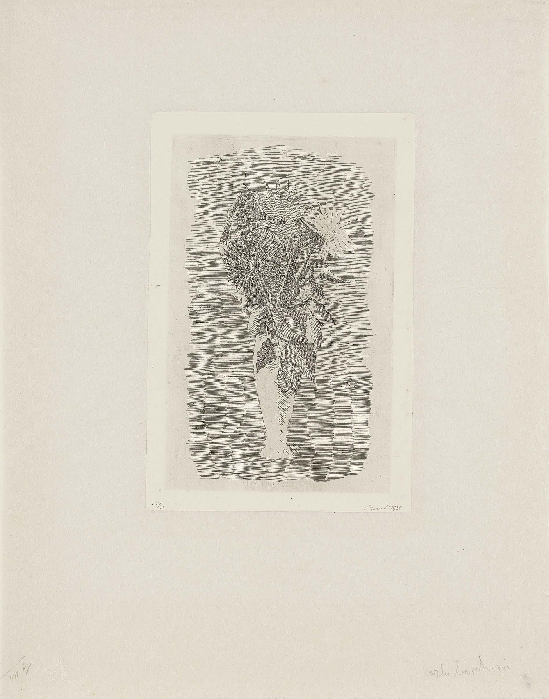 Giorgio Morandi Bologna 1890 - 1964 Fiori in un vasetto bianco, 1928 Acquaforte su zinco, es. 25/30, cm. 24,6x16,3 (lastra), cm. 44,8x34 (carta) Data in lastra a destra verso il basso: 1928, firma e data a matita sul margine in basso a destra: Morandi 1928, in basso a sinistra tiratura: 25/30: timbro a secco Eredità Morandi 1996; al verso su un cartone di supporto: etichetta Mostra Internazionale di Bianco e Nero - Lugano. Secondo stato su tre; tiratura di 30 esemplari numerati. Bibliografia Lamberto Vitali, L'opera grafica di Giorgio Morandi, Giulio Einaudi Editore, Torino, 1964, n. 51; Michele Cordaro, Morandi incisioni. Catalogo Generale, Edizioni Electa, Milano, 1991, p. 58, n. 1928 11.