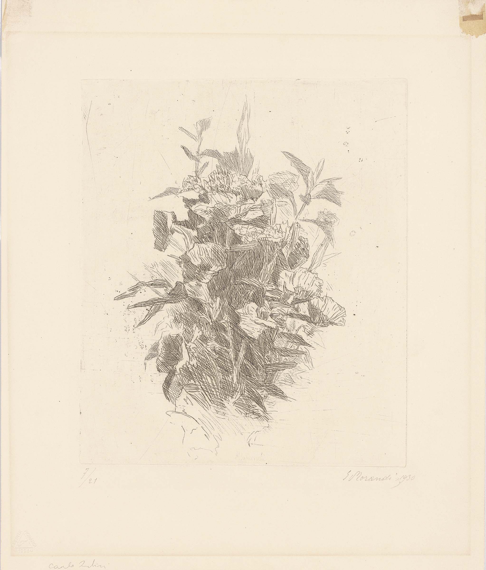 Giorgio Morandi Bologna 1890 - 1964 Fiori di campo, 1930 Acquaforte su zinco, es. 7/21, cm. 24,6x21 (lastra), cm. 36,6x31,2 (carta) Firma e data a matita sul margine in basso a destra: G. Morandi 1930, tiratura in basso a sinistra: 7/21: timbro a secco Finarte Eredità Morandi 1996. Primo stato su due; tiratura di 21 esemplari numerati e 3 prove. Bibliografia Lamberto Vitali, L'opera grafica di Giorgio Morandi, Giulio Einaudi Editore, Torino, 1964, n. 78; Michele Cordaro, Morandi incisioni. Catalogo Generale, Edizioni Electa, Milano, 1991, p. 89, n. 1930 11.
