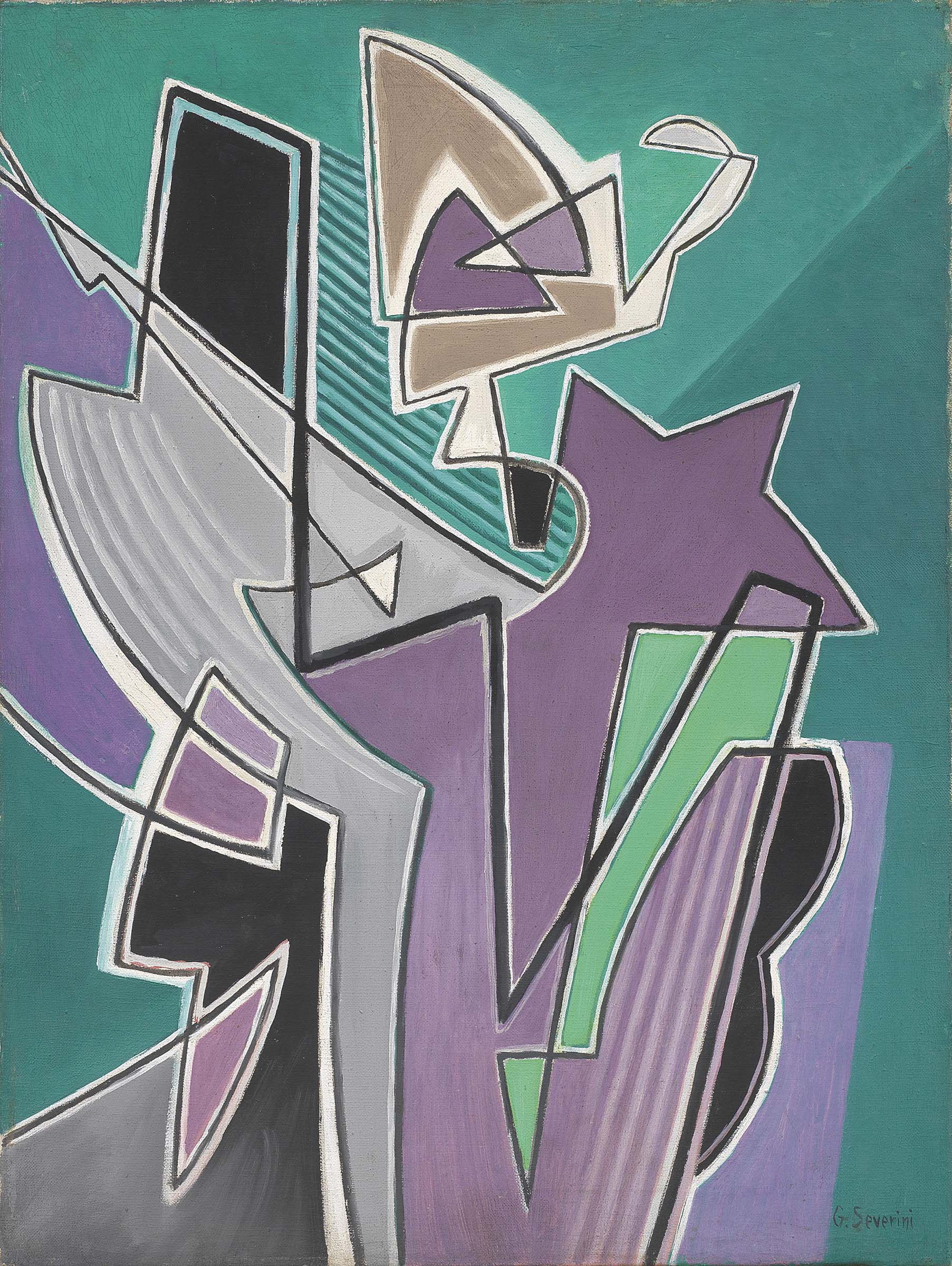 Gino Severini Cortona (Ar) 1883 - Parigi 1966 Rythme d'une danseuse au tutu violet (Danseuse au tutu violet), 1953 Olio su tela, cm. 61x45,6 Firma in basso a destra: G. Severini; al verso sulla tela data e titolo: Paris / 3 / Mars / 1953 / Rytme d'une Danseuse au Tutu Violet; sul telaio: etichetta Galleria Schettini, Milano. Storia Galleria Schettini, Milano; Collezione privata Bibliografia Daniela Fonti, Gino Severini. Catalogo ragionato, Mondadori - Daverio, Milano, 1988, p. 549, n. 905 (con misure errate).