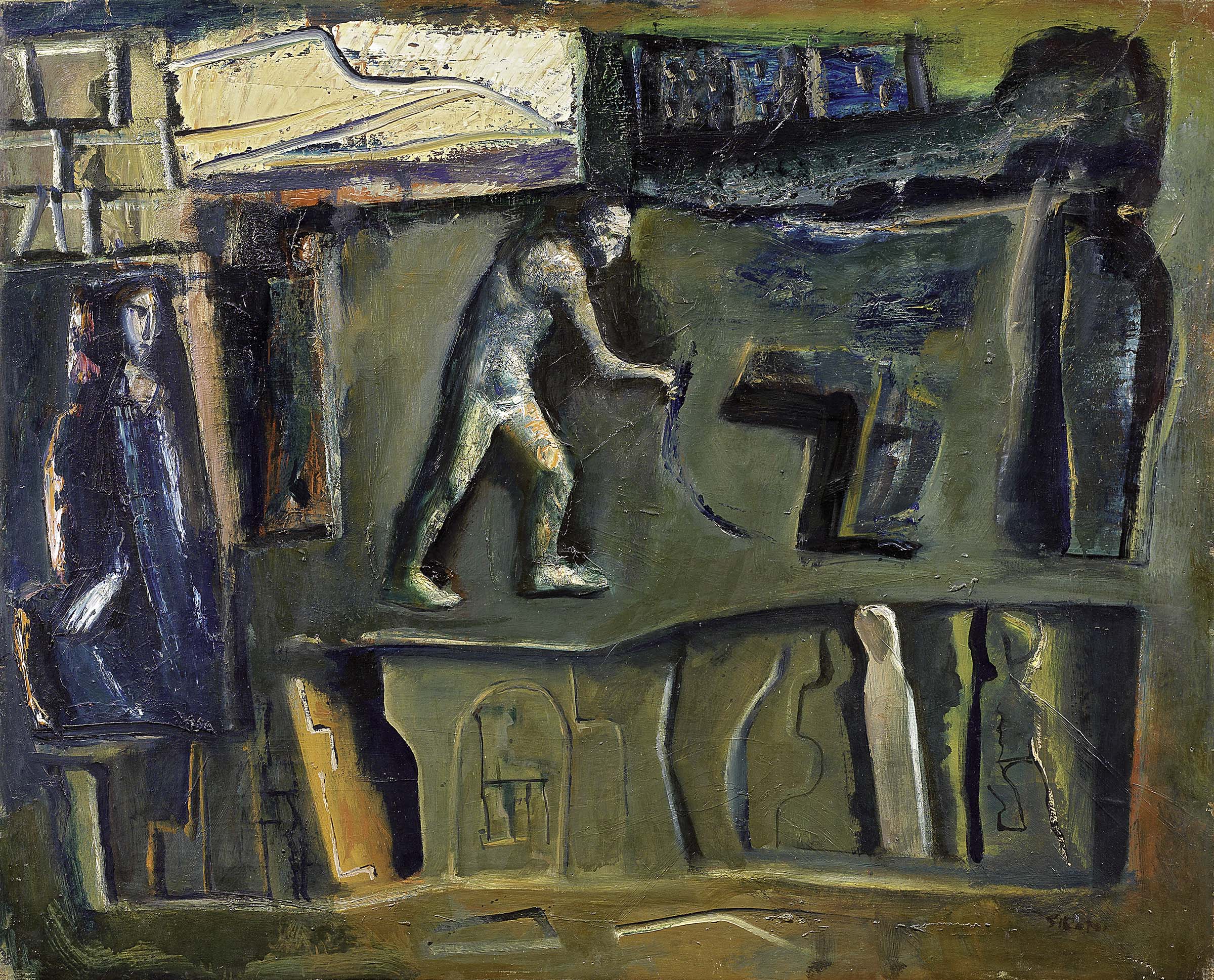 Mario Sironi Sassari 1885 - Milano 1961 Composizione, 1954 ca. Olio su tela, cm. 80,5x100,5 Firma in basso a destra: Sironi. Al verso sul telaio: timbro Galleria del Milione, Milano, con n. 6983; timbro Galleria d'Arte Sacerdoti, Milano. Certificato su foto di Francesco Meloni.