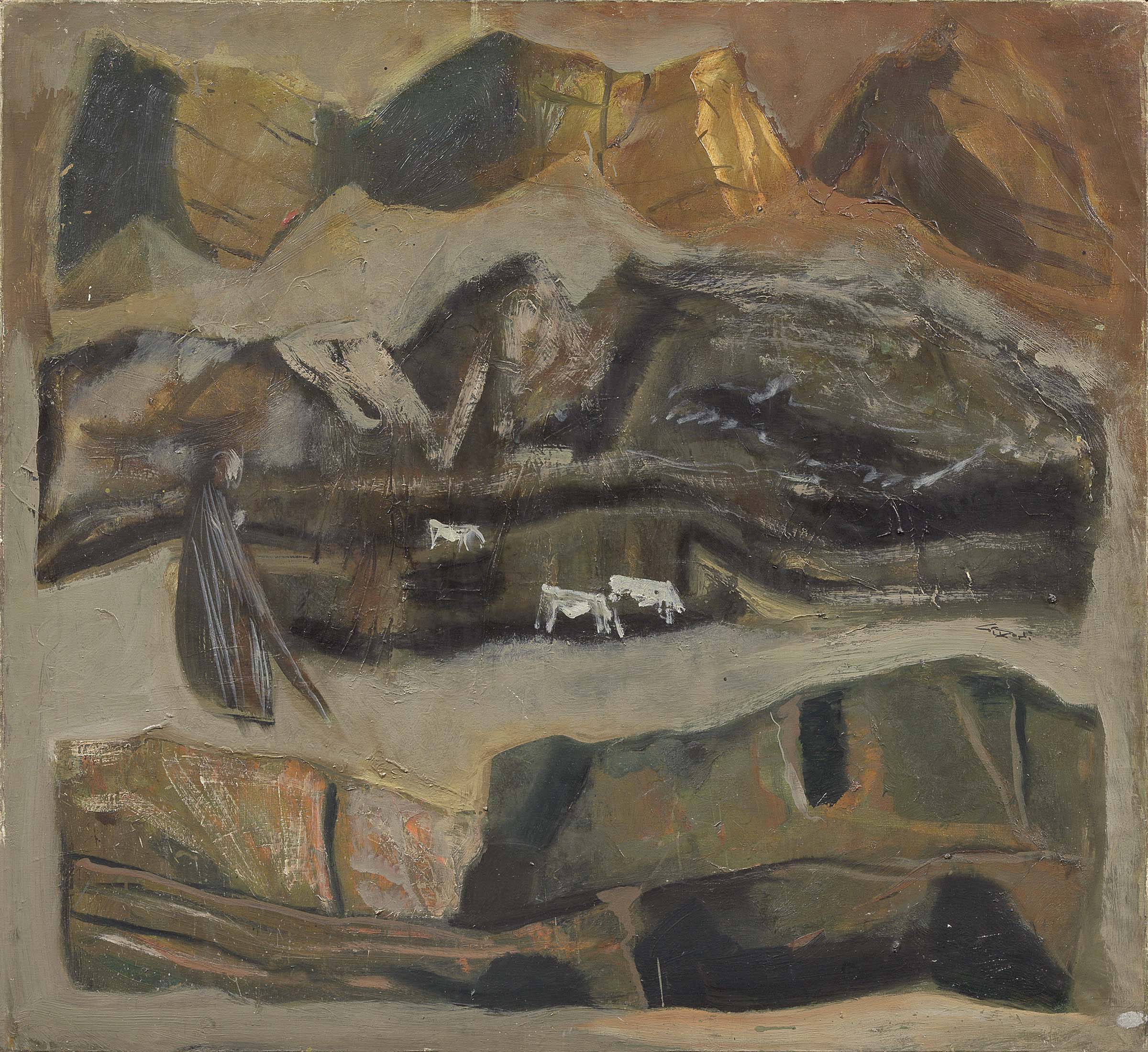 Mario Sironi Sassari 1885 - Milano 1961 Il grande silenzio, 1953 ca. Olio su tela, cm. 110x120 Reca firma sul lato destro al centro: Sironi. Sl verso sulla tela: firma Willy Macchiati: titolo il "Grande silenzio". Certificato su foto di Francesco Meloni, con n. 14780. Esposizioni Internazionale d'Arte Contemporanea, Roma, 1985, cat. p. 15, illustrato.