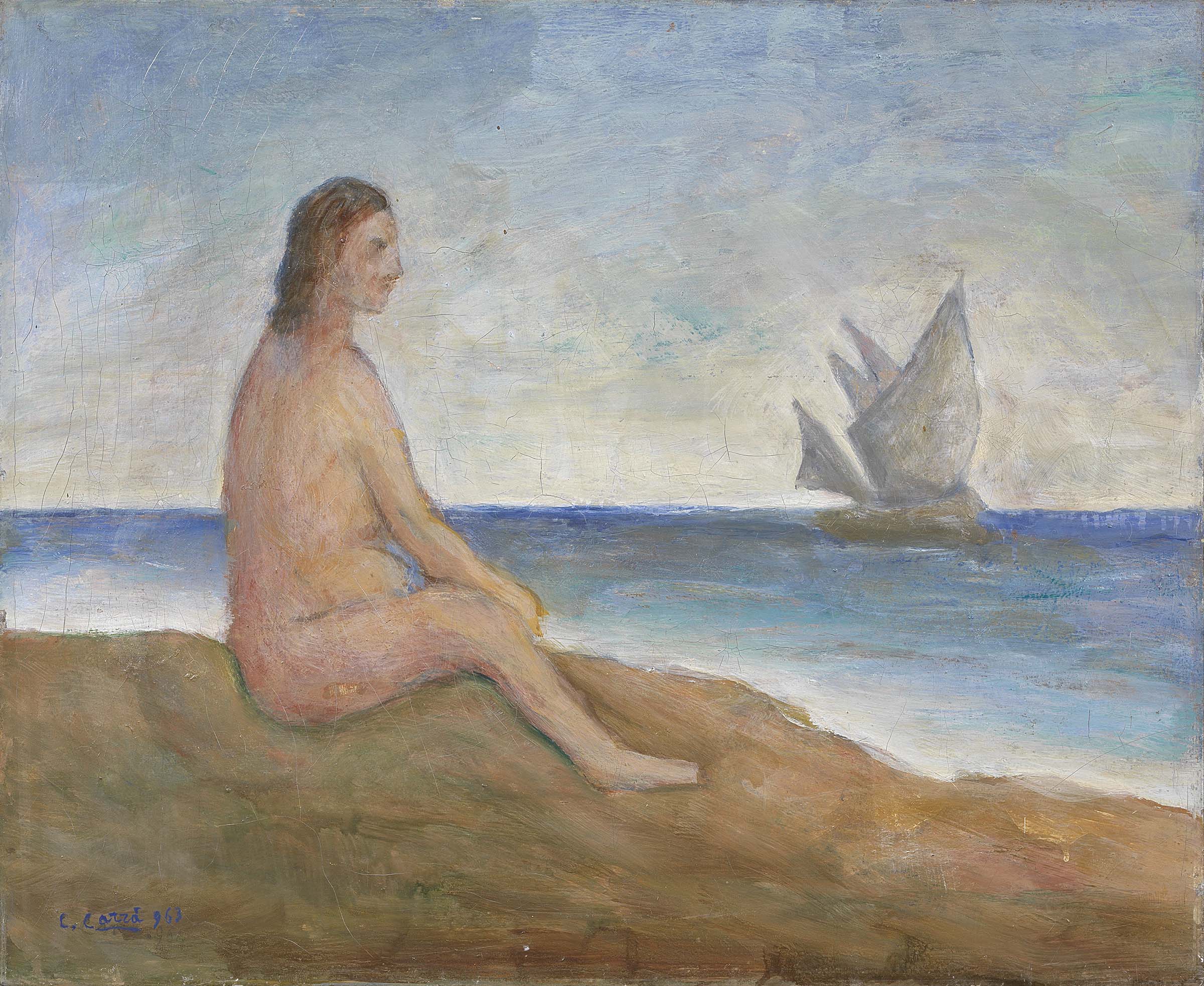 Carlo Carrà Quargnento (Al) 1881 - Milano 1966 La romantica, 1963 Olio su tela, cm. 65,5x80 Firma e data in basso a sinistra: C. Carrà 963. Al verso sulla tela: etichetta IX Quadriennale Nazionale d'Arte di Roma / 1965-66; sul telaio: etichetta La Casa dell'Arte / Sasso Marconi, con n. 995: etichetta 100 opere / di Carlo Carrà / Prato - 15 maggio - 18 giugno 1971, con n. CXXII. Storia Collezione Carrà, Milano; Collezione privata Esposizioni 100 opere di Carlo Carrà, Prato, Galleria Farsetti, 15 maggio - 18 giugno 1971, cat. n. CXXII, illustrato a colori. Bibliografia Massimo Carrà, Carrà, tutta l'opera pittorica volume III, 1951-1966, L'Annunciata / La Conchiglia, Milano, 1968, pp. 515, 586, n. 28/63.